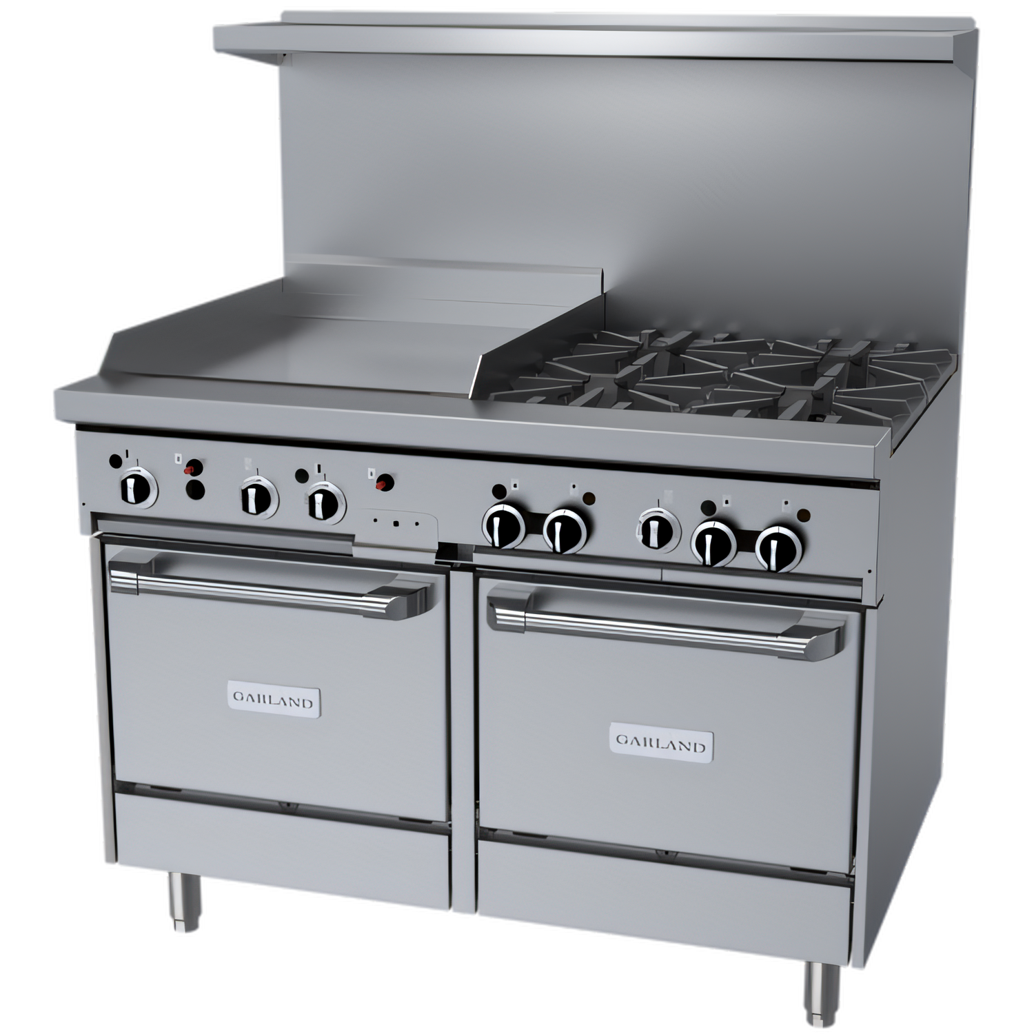 4 Starfire-Pro Open Burners • 24" Thermostatic Griddle • Dual Space-Saver OvensEngineered for high-volume kitchens, the Garland GF Starfire Pro delivers a powerful combination of speed, precision and rugged durability. Four 26,000 BTU Starfire-Pro burners handle sautéing and stock-pot work while the 24" griddle—with a true 5⁄8" (15 mm) steel plate and snap-action thermostatic control—turns out perfectly caramelised pancakes, burgers and more. Two space-saver ovens complete the 48" footprint, giving you the throughput of a much larger range without sacrificing line space.