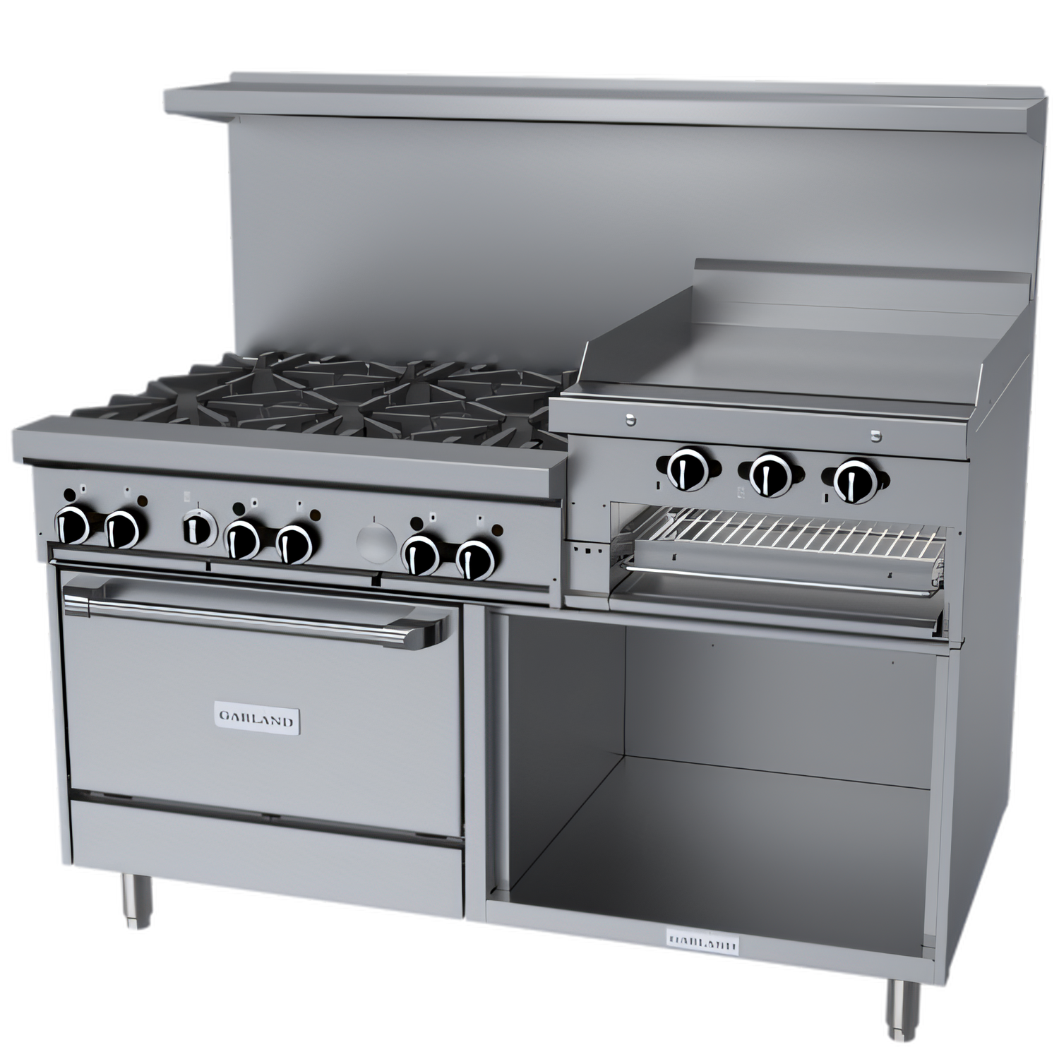 Model GF60-6R24RS | 6 Burners • 24" Raised Griddle/Broiler • Std. Oven + Storage BaseBuilt for chefs who refuse to compromise on power, capacity or reliability, the Garland GF Starfire Pro combines six 26,000 BTU open burners, a heavy-duty 24" raised griddle/broiler and a full-size chef’s oven into one rugged 60" platform—backed by full flame-failure protection on every burner.