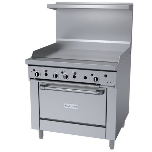 GFE Starfire Pro Series Restaurant Range, gas, 36", flame failure protection, electric pilot ignition, 36” griddle, thermostat control 175° - 425°F, 5/8" thick smooth steel plate, convection oven with 3-position rack guides & (3) racks, stainless steel front, sides, plate rail and 10" low profile back guard, 6" stainless steel legs with adjustable feet, 92,000 BTU, CSA Flame, CSA Star, cCSAus, CE, NSF (Garland)
