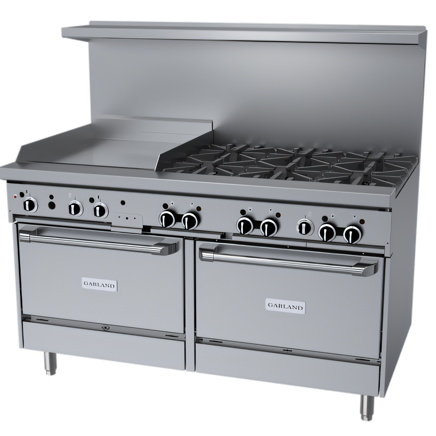 6 Open Burners • 24" Thermostatic Griddle • Dual Standard OvensBuilt for busy commercial kitchens that demand power, precision and durability, the Garland GFE Starfire Pro delivers a massive 268,000 BTU of cooking performance across six high-output open burners, a full-size 24" griddle and two roomy chef’s ovens—all in a single 60" footprint.