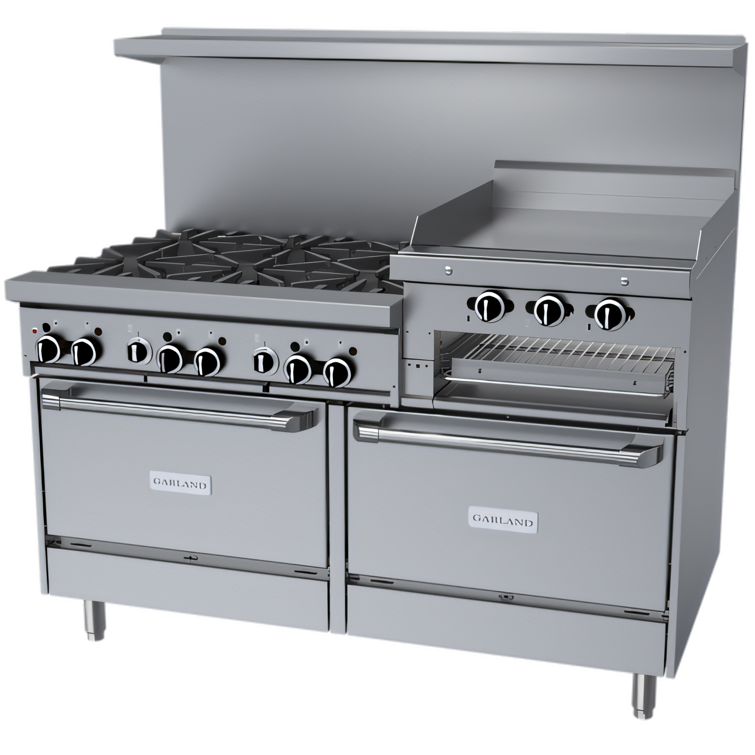 Model GFE60-6R24RR – 6 Open Burners • 24" Raised Griddle/Broiler • (2) Standard OvensPower, versatility and rugged construction converge in Garland’s flagship Starfire Pro range. Engineered for high-volume kitchens, this 60" workhorse delivers 265,000 BTU/h of precise, responsive heat across open burners, a raised griddle/broiler and two extra-large ovens— all protected by full flame-failure safety and electric spark ignition.