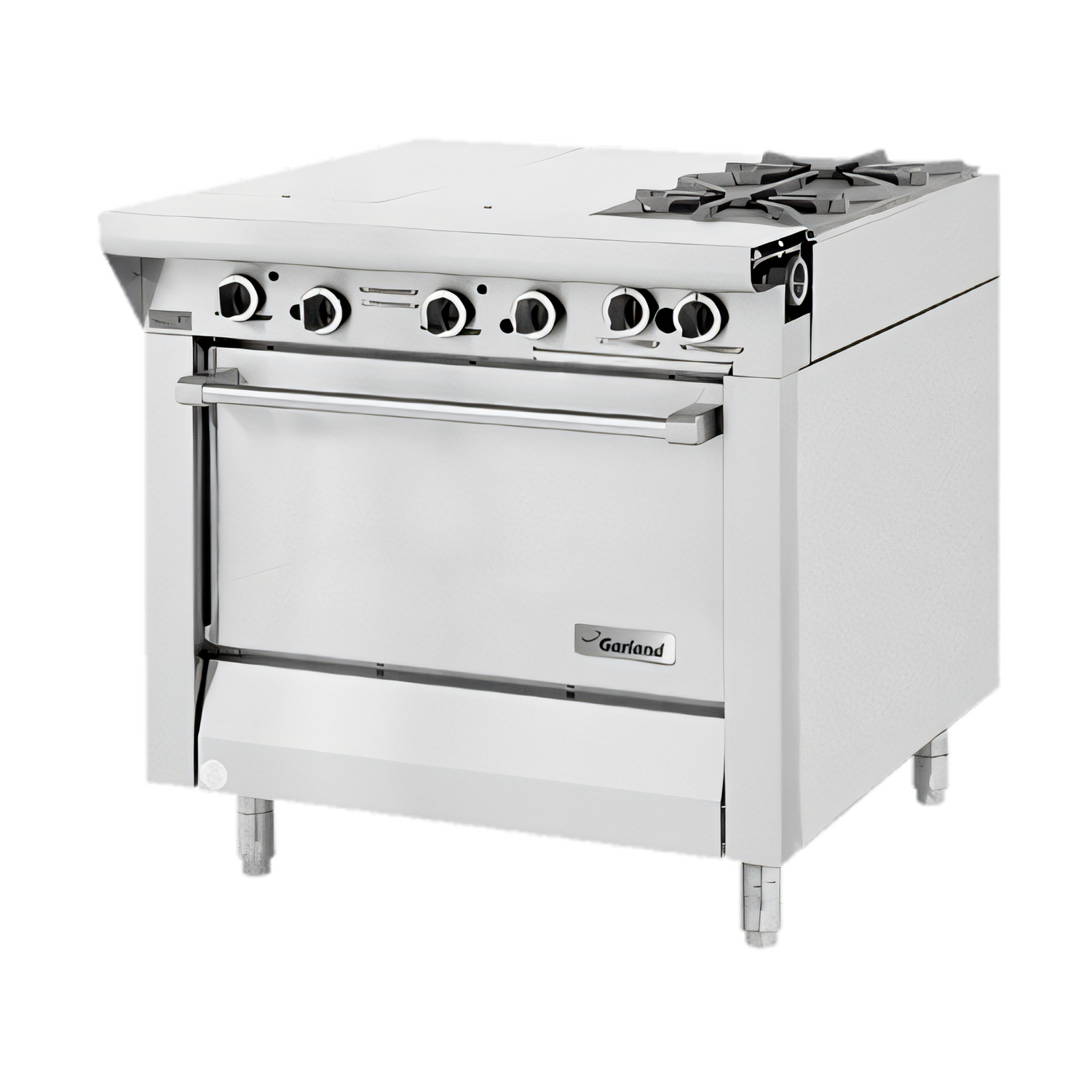 Model reference: M43-1R ( open burners + hot top + standard oven )Built to thrive in the most demanding kitchens, this Master Series range combines four 24,000 BTU Starfire™ open burners, a 12" even-heat hot top and a powerful standard oven inside a rugged, all-stainless frame only 34" wide.