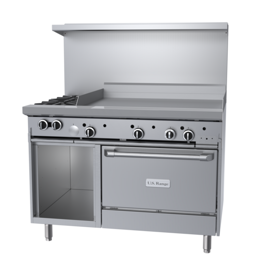 U Series Restaurant Range, gas, 48", (2) 32,000 BTU open burners, (1) 36" griddle, 5/8" thick steel plate, (1) convection oven with 3 position rack guides and 3 racks, (1) storage base, stainless steel front, sides, plate rail, 2-piece back guard and shelf, 6" stainless steel legs with adjustable feet, 156,000 BTU, CSA Flame, CSA Star, cCSAus, NSF (US Range)