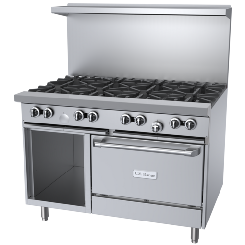 U Series Restaurant Range, gas, 48", (8) 32,000 BTU open burners, with cast iron top & ring grates, (1) convection oven with 3 position rack guides and 3 racks, (1) storage base, stainless steel front, sides, plate rail, 2-piece back guard and shelf, 6" stainless steel legs with adjustable feet, 294,000 BTU, CSA Flame, CSA Star, cCSAus, NSF (US Range)