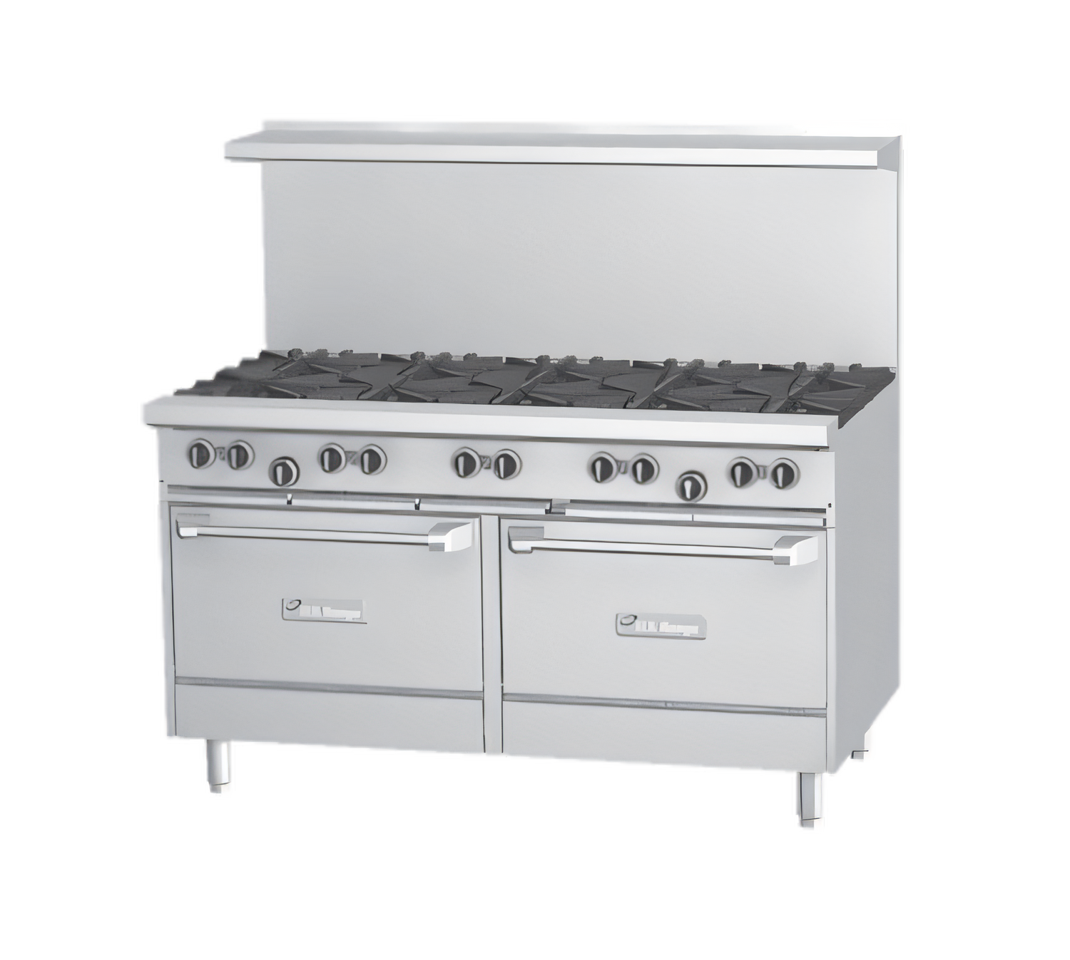 - Dual standard ovens (38,000 BTU each) fit standard sheet pans side-to-side or front-to-back and feature snap-action thermostats from low to 500 °F (260 °C).