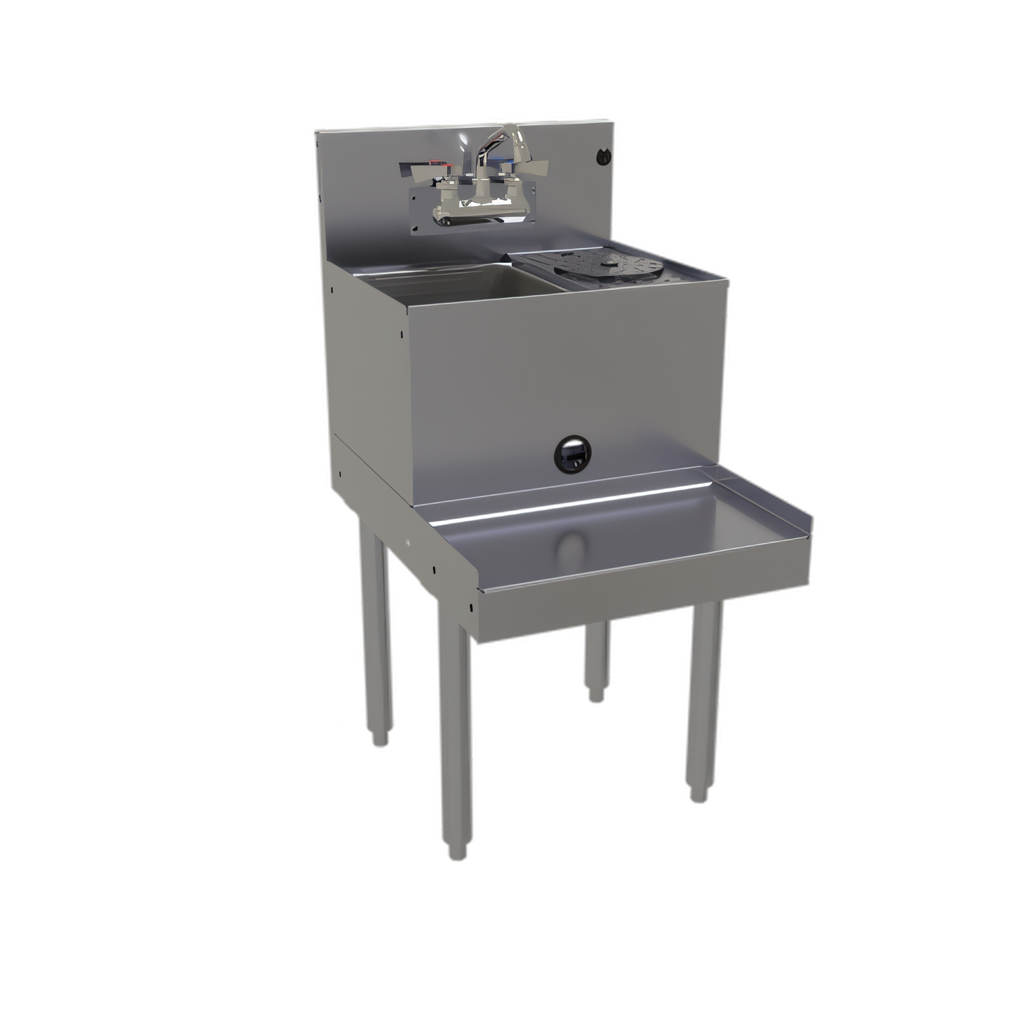 Blender Station with Rinser Faucet, 18”W x 24”D, includes sink with lift-out perforated plastic wet waste strainer, splash mount hot & cold water faucet, push-down rinser faucet with 6” diameter pusher plate, 9” deep blender shelf, power cord hole with grommet in front skirt, junction box for duplex outlet mounted underneath blender shelf (outlet not included), stainless steel construction, low lead compliant, ETL-Sanitation (NOTE: Made to order, not returnable)