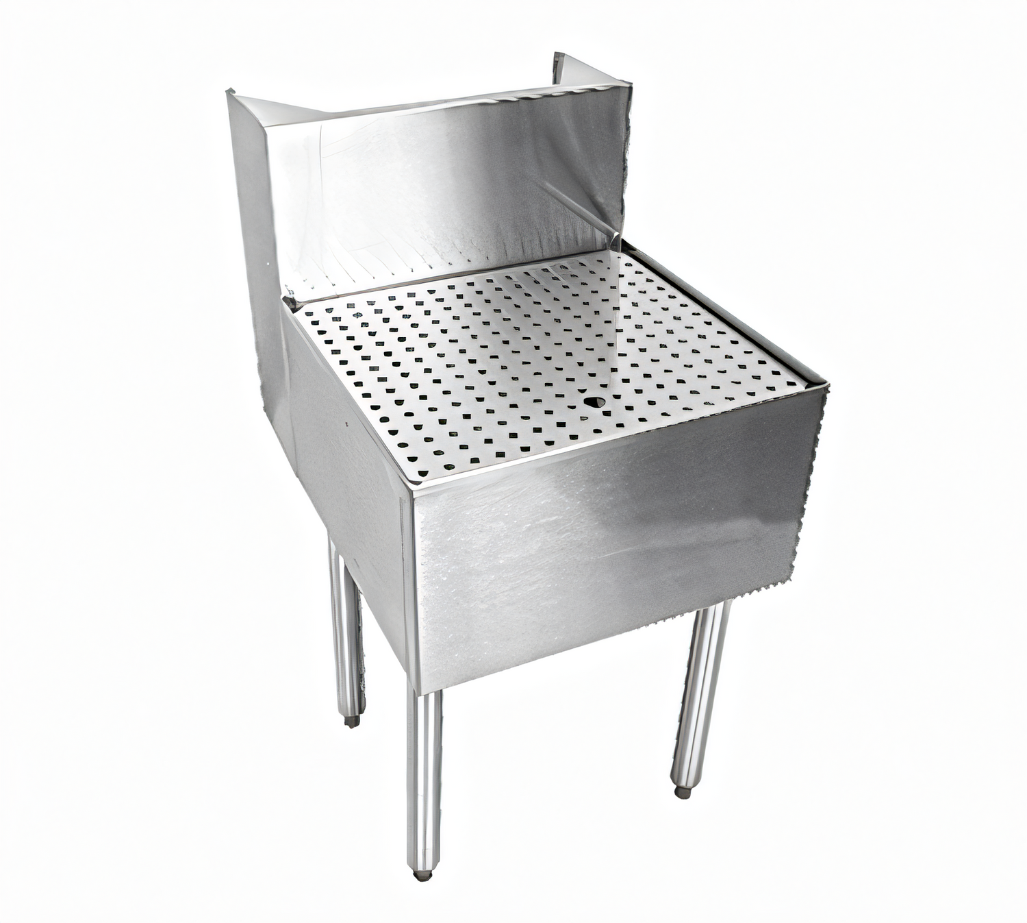 CHOICE Underbar Beer Drainer, 24"W x 24"D, backsplash moved forward 5" for beverage line access, front drain pan with lift-out perforated insert, 26"H work surface, stainless steel construction, stainless steel legs with adjustable stainless steel bullet feet, ETL-Sanitation (NOTE: Made to order, not returnable)