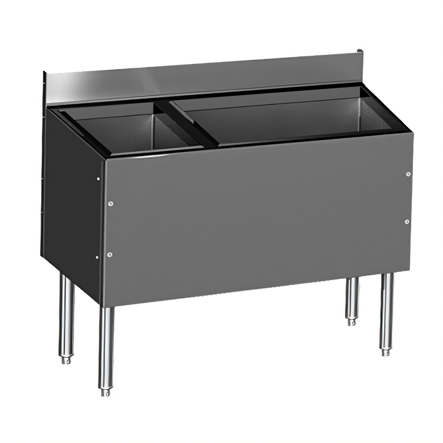 CHOICE Underbar Combo Ice Bin/Cocktail Unit, with bottle well storage, 42"W x 19"D, built-in 10-circuit cold plate, 84-lbs. ice capacity, 6-bottle insulated storage compartment on left, 10-1/2" deep bin liner, backsplash with open channel for beverage lines, PVC plastic breaker strip around ice bin liner, stainless steel construction, stainless steel legs with adjustable stainless steel bullet feet, ETL-Sanitation