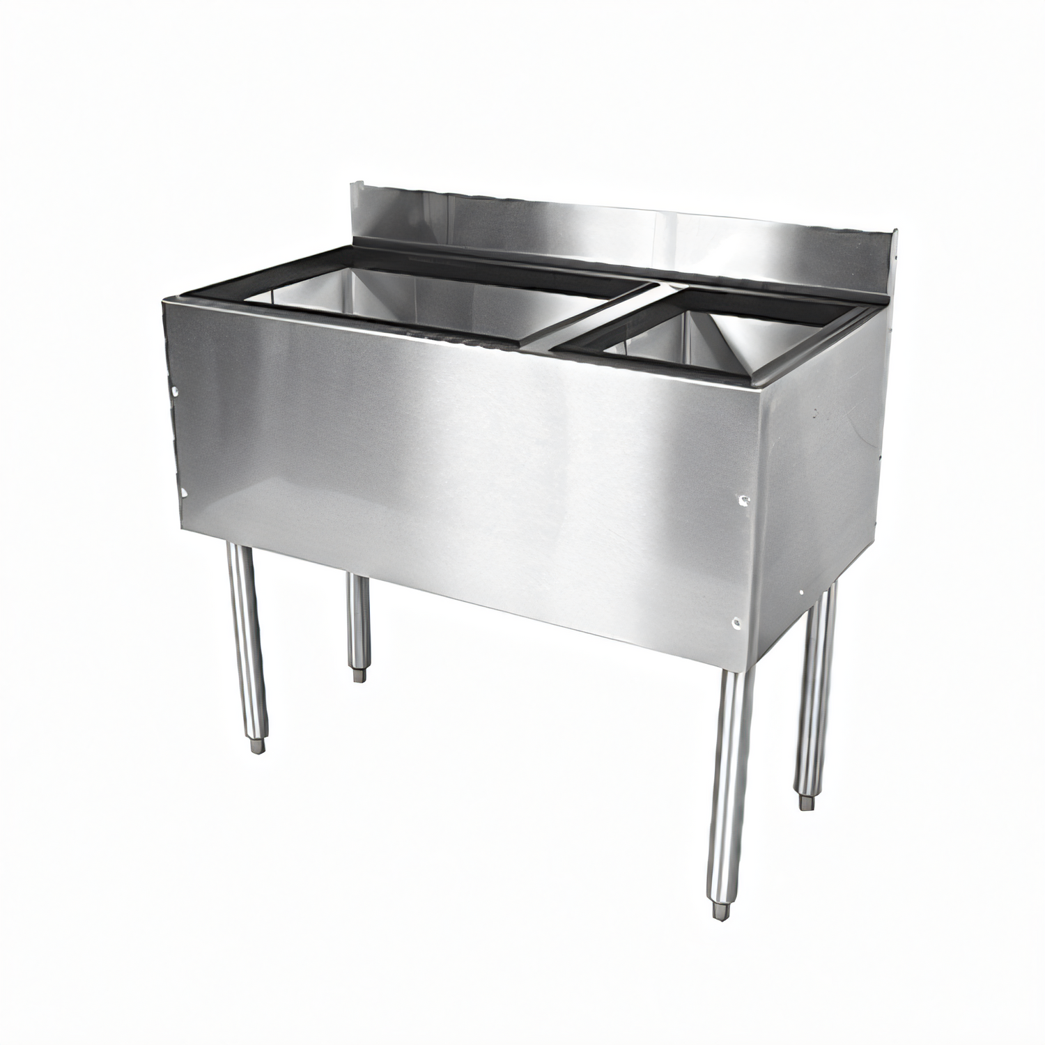 CHOICE Underbar Combo Ice Bin/Cocktail Unit, with bottle well storage, 48"W x 19"D, 67-lbs. ice capacity, 6-bottle insulated storage compartment each side (12) total, 10-1/2" deep bin liner, backsplash with open channel for beverage lines, PVC plastic breaker strip around ice bin liner, 1-1/2" welded tailpiece, stainless steel construction, stainless steel legs with adjustable stainless steel bullet feet, ETL-Sanitation (NOTE: Made to order, not returnable)