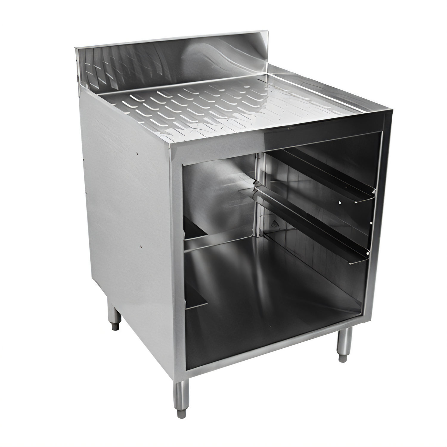 CHOICE Glass Rack Storage Unit, drainboard top, 18"W x 24"D, open front base, corrugated work surface, holds (3) 16" dia. glass racks (used for GT-18), one-piece seamless top & backsplash with radius corners, stainless steel construction, stainless steel legs with adjustable stainless steel bullet feet, ETL-Sanitation
