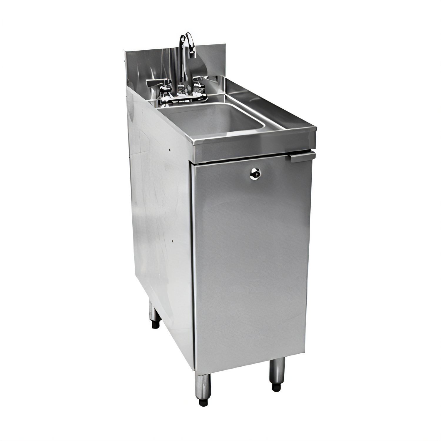 CHOICE Sink Cabinet, 12"W x 24"D, hinged door, 9-1/4" wide x 11-1/2" front-to-back x 6" deep sink bowl, chemical storage area holds (3) 1-gallon containers, deck mount gooseneck faucet (low lead compliant), one-piece seamless top & backsplash with radius corners, (1) field-reversible hinged door with lock, all welded stainless steel construction, stainless steel legs with adjustable stainless steel bullet feet, ETL-Sanitation