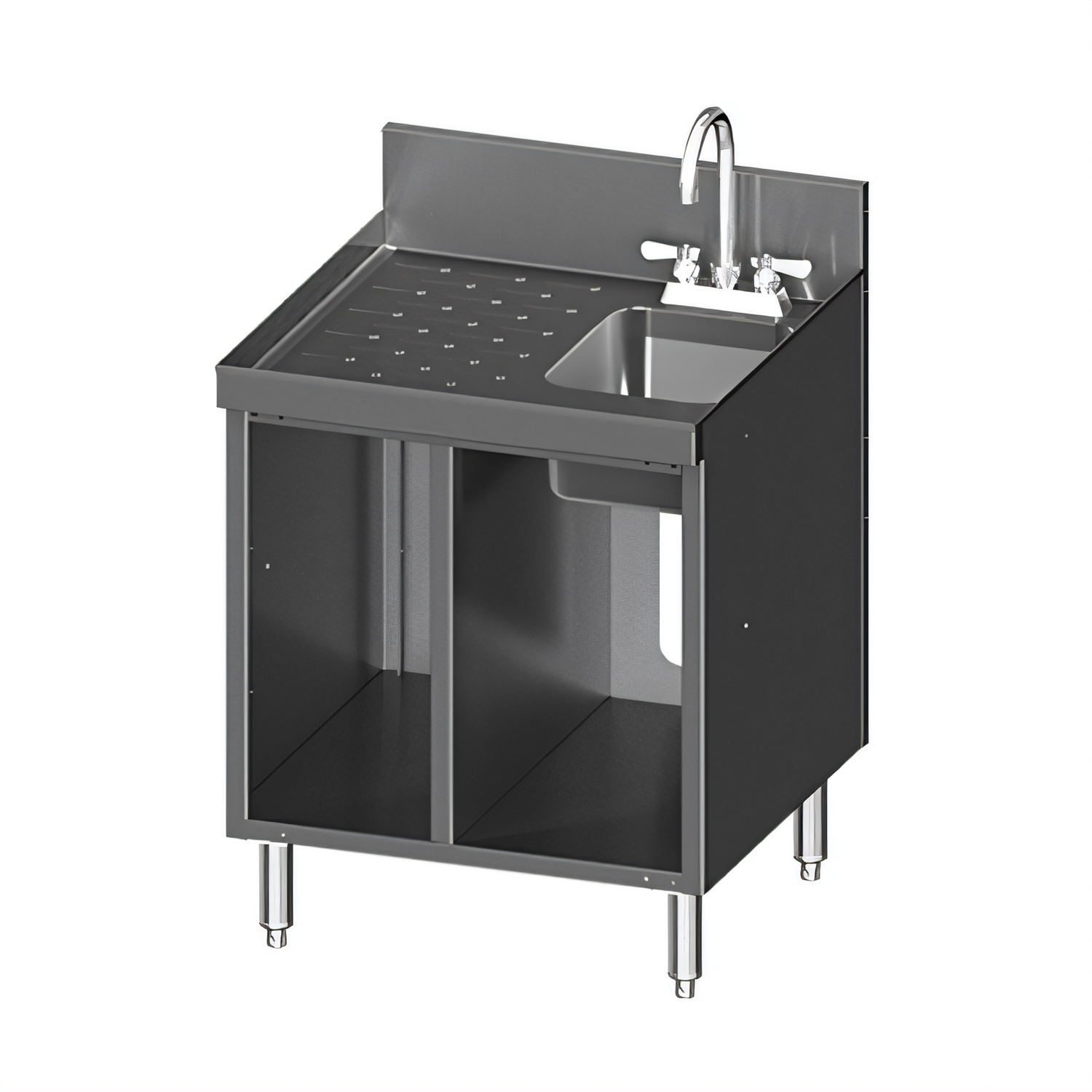 Glastender 24" CHOICE sink cabinet: durable stainless steel, 6" bowl, left drainboard, chemical storage, deck-mount faucet, ETL-Sanitation certified.