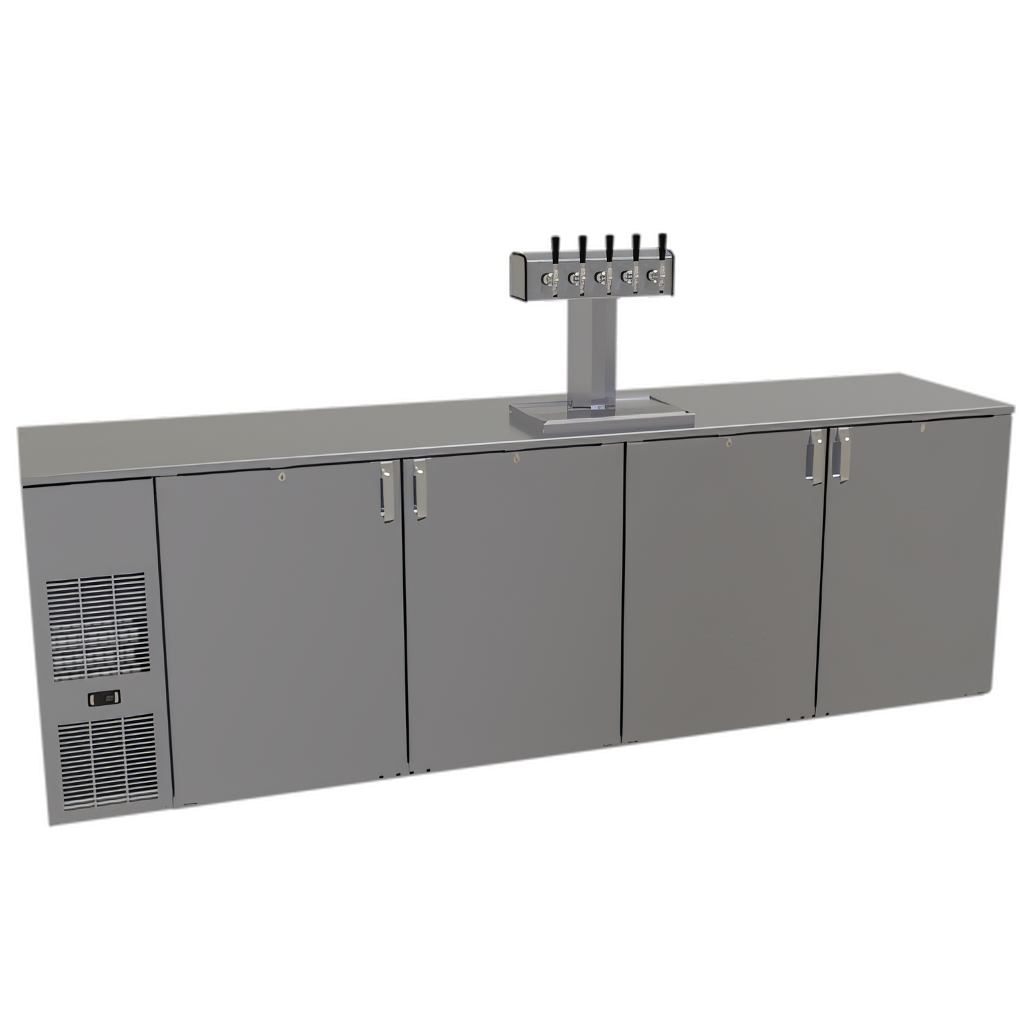 Draft Dispensing Cooler, one zone, front serviced, bar profile, 108"W, four-section, 20"W door opening, self-contained refrigeration, bright white LED interior lighting, front venting, stainless steel interior with keg racks, 1" stainless steel finished top, galvanized steel back, R290 Hydrocarbon refrigerant, 1/4 HP, NSF Standard 7 for open food storage, cETLus, ETL-Sanitation, ETL Verified