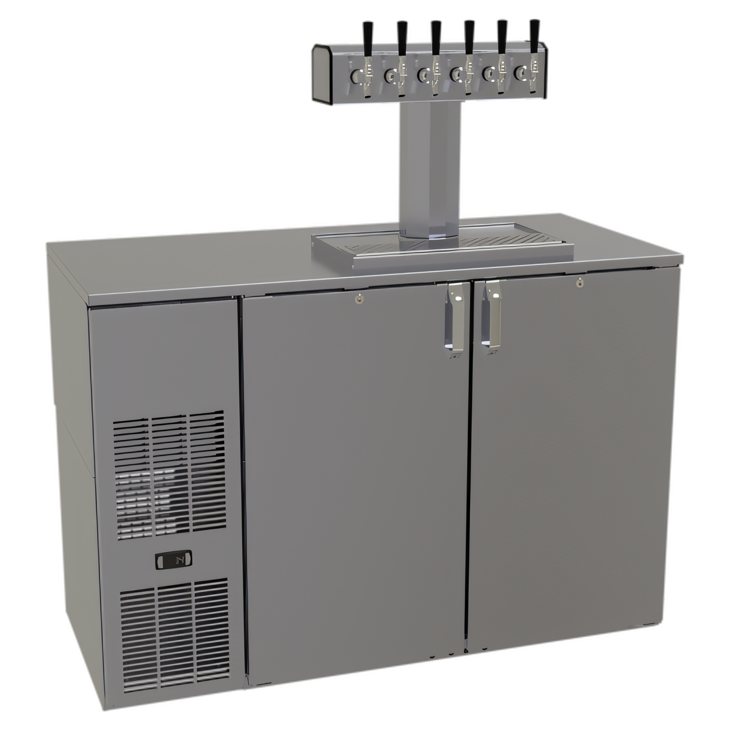 Draft Dispensing Cooler, one zone, front serviced, bar profile, 52"W, two-section, 16"W door opening, self-contained refrigeration, bright white LED interior lighting, front venting, stainless steel interior with keg racks, 1" stainless steel finished top, galvanized steel back, R290 Hydrocarbon refrigerant, 1/6 HP, NSF Standard 7 for open food storage, cETLus, ETL-Sanitation, ETL Verified