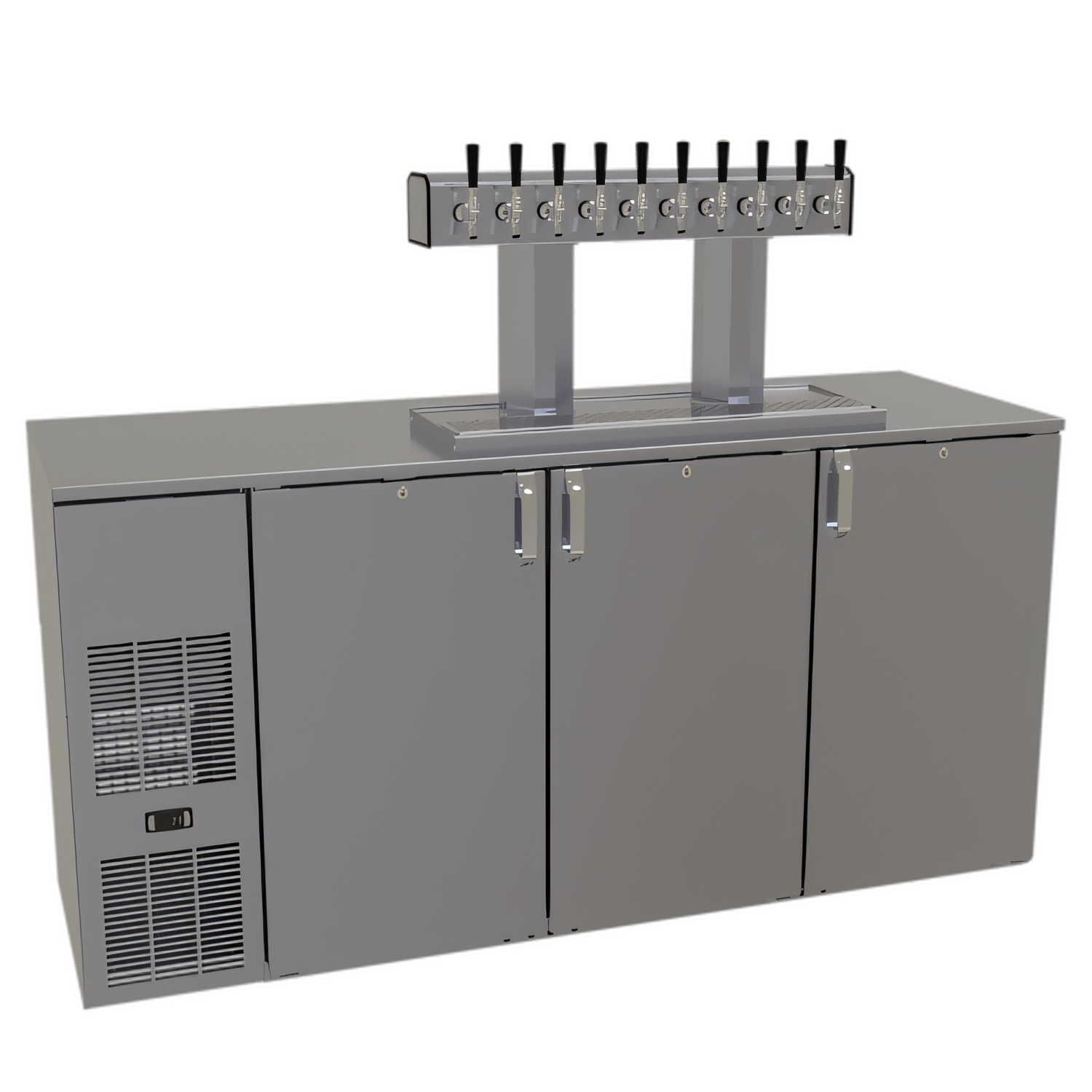 Draft Dispensing Cooler, one zone, front serviced, bar profile, 72"W, three-section, 16"W door opening, self-contained refrigeration, bright white LED interior lighting, front venting, stainless steel interior with keg racks, 1" stainless steel finished top, galvanized steel back, R290 Hydrocarbon refrigerant, 1/4 HP, NSF Standard 7 for open food storage, cETLus, ETL-Sanitation, ETL Verified