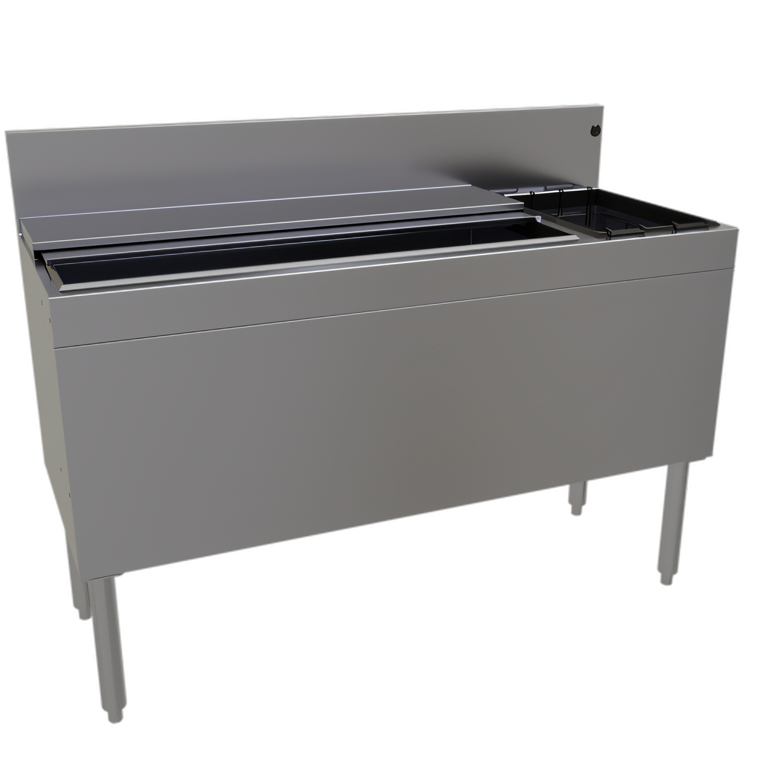 Extra Deep Underbar Ice Bin/Cocktail Unit, with bottle well storage, 48"W x 19"D, built-in 10-circuit cold plate, 139 lbs. ice capacity, 14-1/2" deep bin liner, ABS plastic breaker strip around ice bin liner, includes stainless steel sliding covers, 6-bottle insulated storage compartment on right, stainless steel construction, stainless steel legs with adjustable bullet feet, ETL-Sanitation (NOTE: Made to order, not returnable)