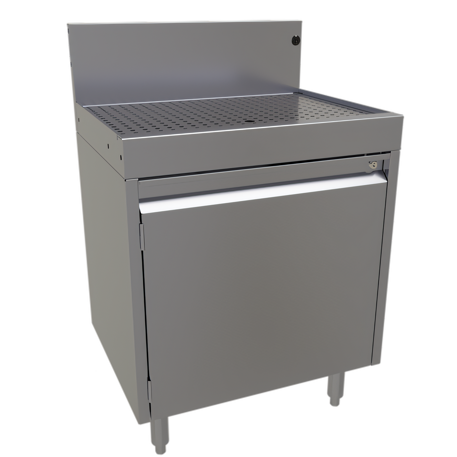 Underbar Drainboard, cabinet base with hinged door, 24"W x 19"D, drain pan with removable perforated insert, hinged door includes integral handle & lock, adjustable bottom & intermediate shelf, stainless steel construction, adjustable stainless steel bullet feet, ETL-Sanitation (NOTE: Made to order, not returnable)