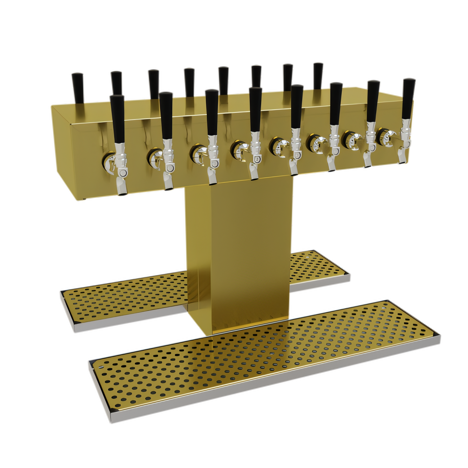 Double-Sided Draft Dispensing Tower, countertop, (16) stainless steel faucets (handles not included), glycol-cooled, (1) 6-3/4" W insulated column, insulated cold plate assembly, (2) mirror finish surface mount drain pans with brass finish removable inserts, all stainless steel construction, polished brass finish (NOTE: Made to order, not returnable)
