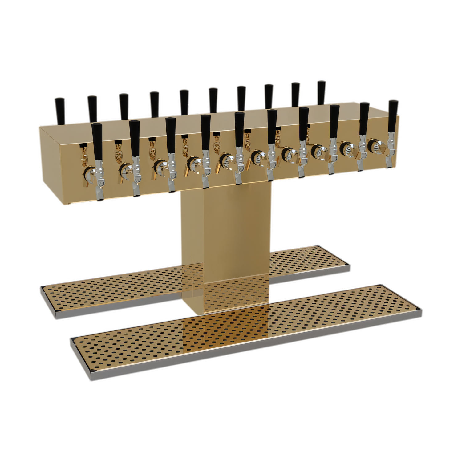 Double-Sided Draft Dispensing Tower, countertop, (20) stainless steel faucets (handles not included), glycol-cooled, (1) 6-3/4" W insulated column, insulated cold plate assembly, (2) mirror finish surface mount drain pans with brass finish removable inserts, all stainless steel construction, polished brass finish (NOTE: Made to order, not returnable)