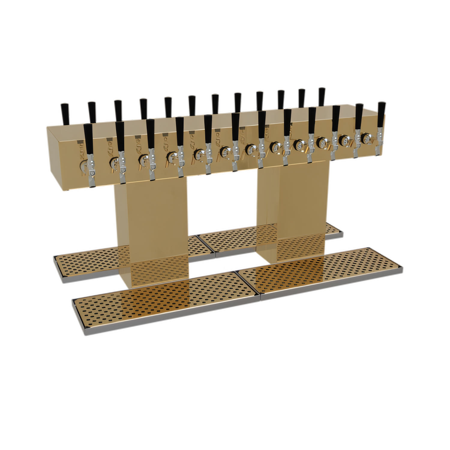 Double-Sided Draft Dispensing Tower, countertop, (24) stainless steel faucets (handles not included), glycol-cooled, (2) 6-3/4" W insulated columns, insulated cold plate assembly, (4) mirror finish surface mount drain pans with brass finish removable inserts, all stainless steel construction, polished brass finish (NOTE: Made to order, not returnable)