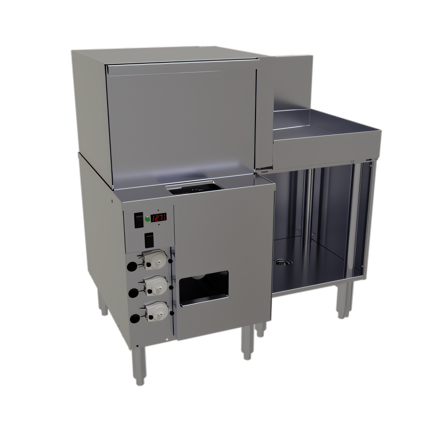 Glasswasher Station, front-to-side pass-thru, 36"W x 24"D O.A., 18"W door type glasswasher with 18"W drain table on right, low temperature chemical sanitizing, washes (720) 2-1/2" diameter glasses per hour, 10" maximum glass height, intelligent microprocessor control, automatic chemical pumps, digital temperature gauge, prime switch, removable top & side panels, external chemical storage, includes (2) 16" diameter polypropylene racks & (2) curtains, stainless steel construction, stainless steel legs with adjustable feet, 1/6 HP water pump, cETLus, ETL-Sanitation