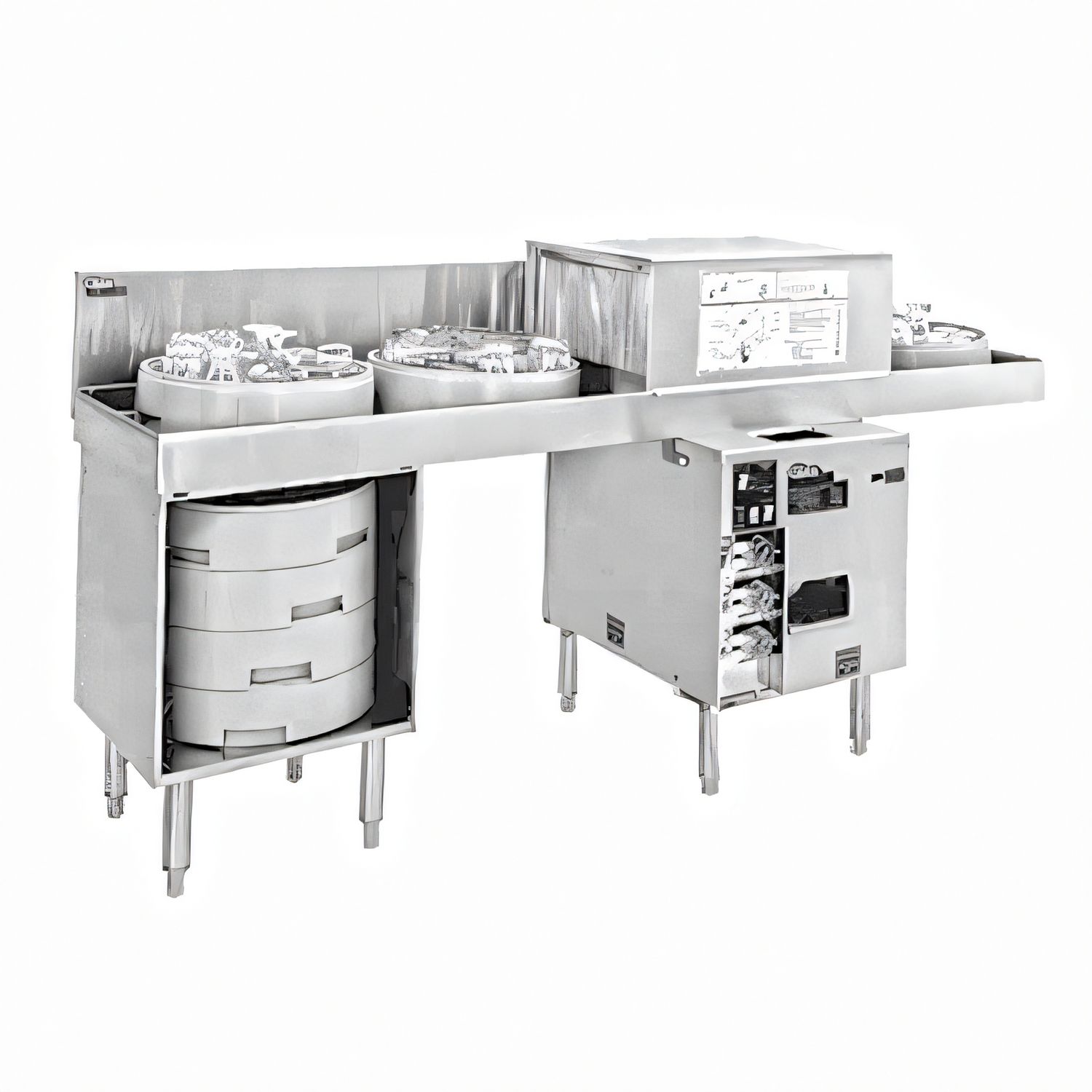 Glasswasher Station, side-to-side pass-thru, 78"W x 24"D O.A., 18"W glasswasher with 36"W drain table on right & 18"W drain table on left, low temperature chemical sanitizing, washes (720) 2-1/2" diameter glasses per hour, 10" maximum glass height, intelligent microprocessor control, automatic chemical pumps, digital temperature gauge, prime switch, removable top & side panels, external chemical storage, includes (3) 16" diameter polypropylene racks & (2) curtains, stainless steel construction, stainless steel legs with adjustable feet, 1/6 HP water pump, cETLus, ETL-Sanitation (NOTE: Made to order, not returnable)