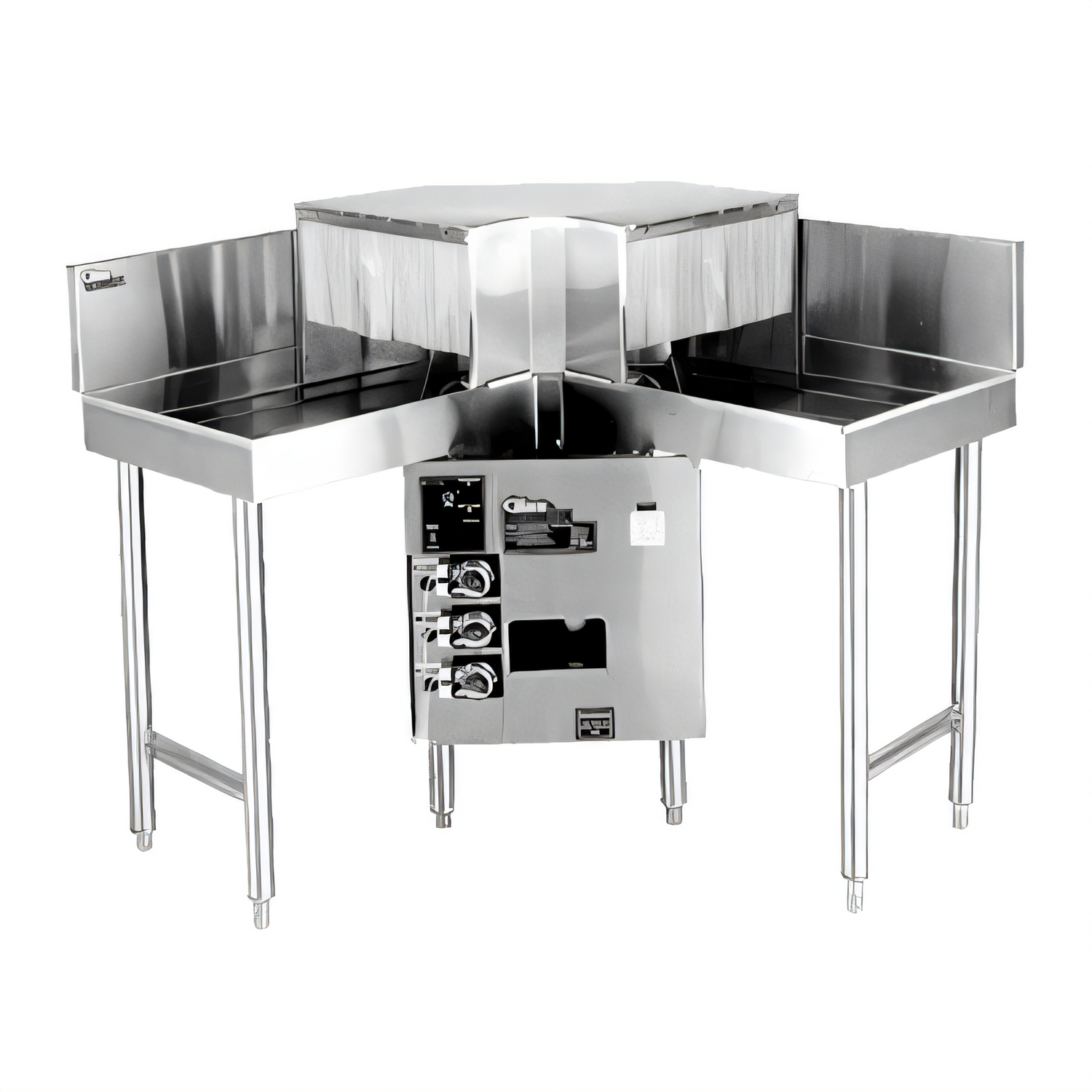 Glasswasher Station, corner pass-thru, 42"W x 19"D O.A., 18"W glasswasher with built-in corner drain tables, low temperature chemical sanitizing, washes (720) 2-1/2" diameter glasses per hour, 10" maximum glass height, intelligent microprocessor control, automatic chemical pumps, digital temperature gauge, prime switch, removable top & side panels, external chemical storage, includes (2) 16" diameter polypropylene racks & (2) curtains, stainless steel construction, stainless steel legs with adjustable feet, 1/6 HP water pump, cETLus, ETL-Sanitation (NOTE: Made to order, not returnable)