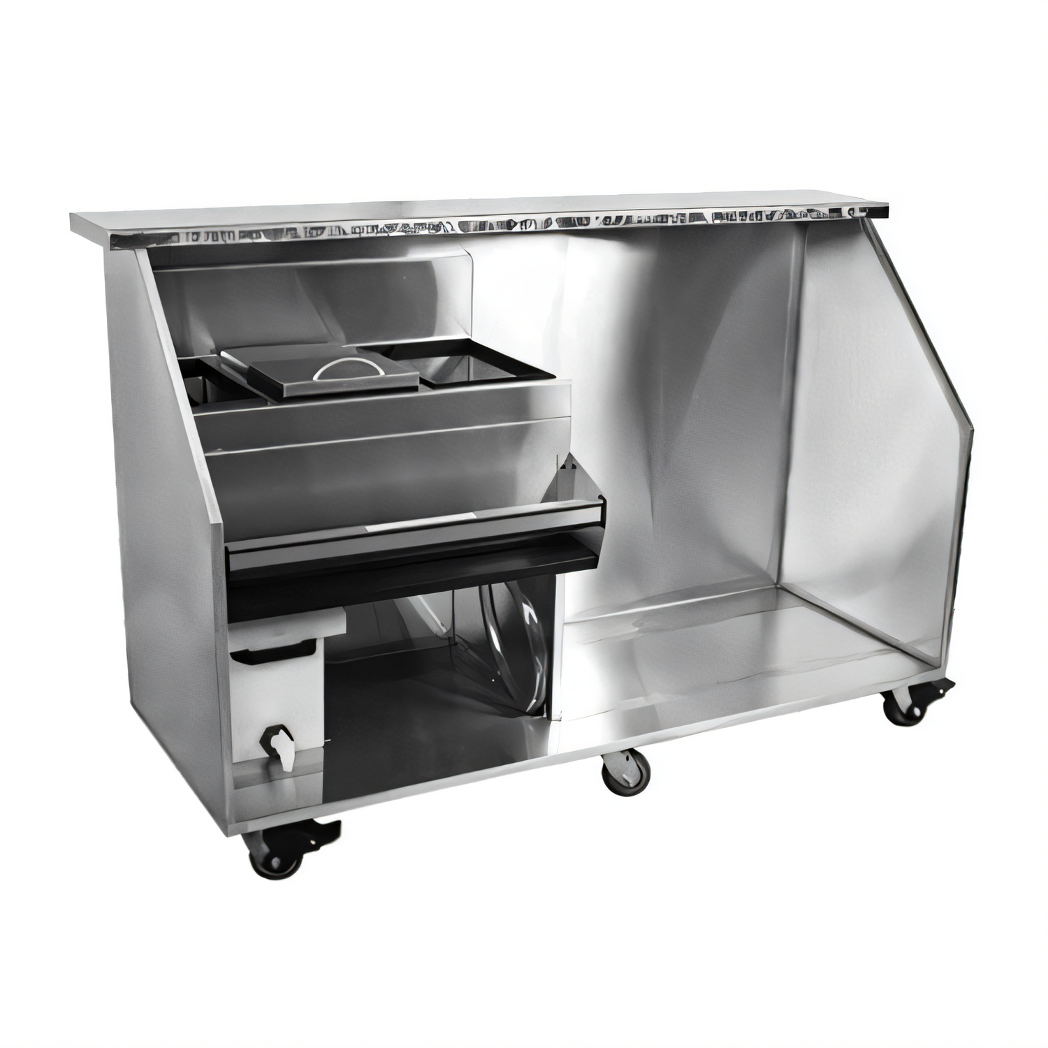 Portable Bar, for stackable cups with space for refrigerator, 78"W x 28"D x 46-7/8"H O.A., includes: 78"W x 12"D stainless steel bar top with feathered jewel finish, (1) 12"W insulated ice bin with sliding cover & drain, rear condiment area with hinged cover & (3) cups, (1) 18"W iced beverage compartment with drain, (1) 6"W cup storage well for (3) rows up 4-1/4" diameter, built-in speed rail with ABS sound deadening, storage shelf, 6-gallon plastic drain tank with hose & on-off valves, built-in 36"W space for refrigerator (refrigerator not included), stainless steel construction, (6) 4" rubberized casters (2 locking), ETL-Sanitation (NOTE: Made to order, not returnable)