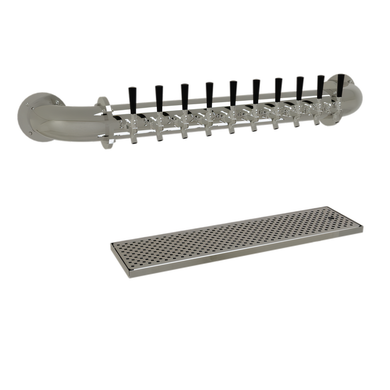 Pipe Wall Draft Dispensing Tower, wall mount, (10) stainless steel faucets (handles not included), glycol-cooled, insulated cold plate assembly, surface mount drain pan with removable perforated insert, all stainless steel construction, mirror finish (NOTE: Made to order, not returnable)"
