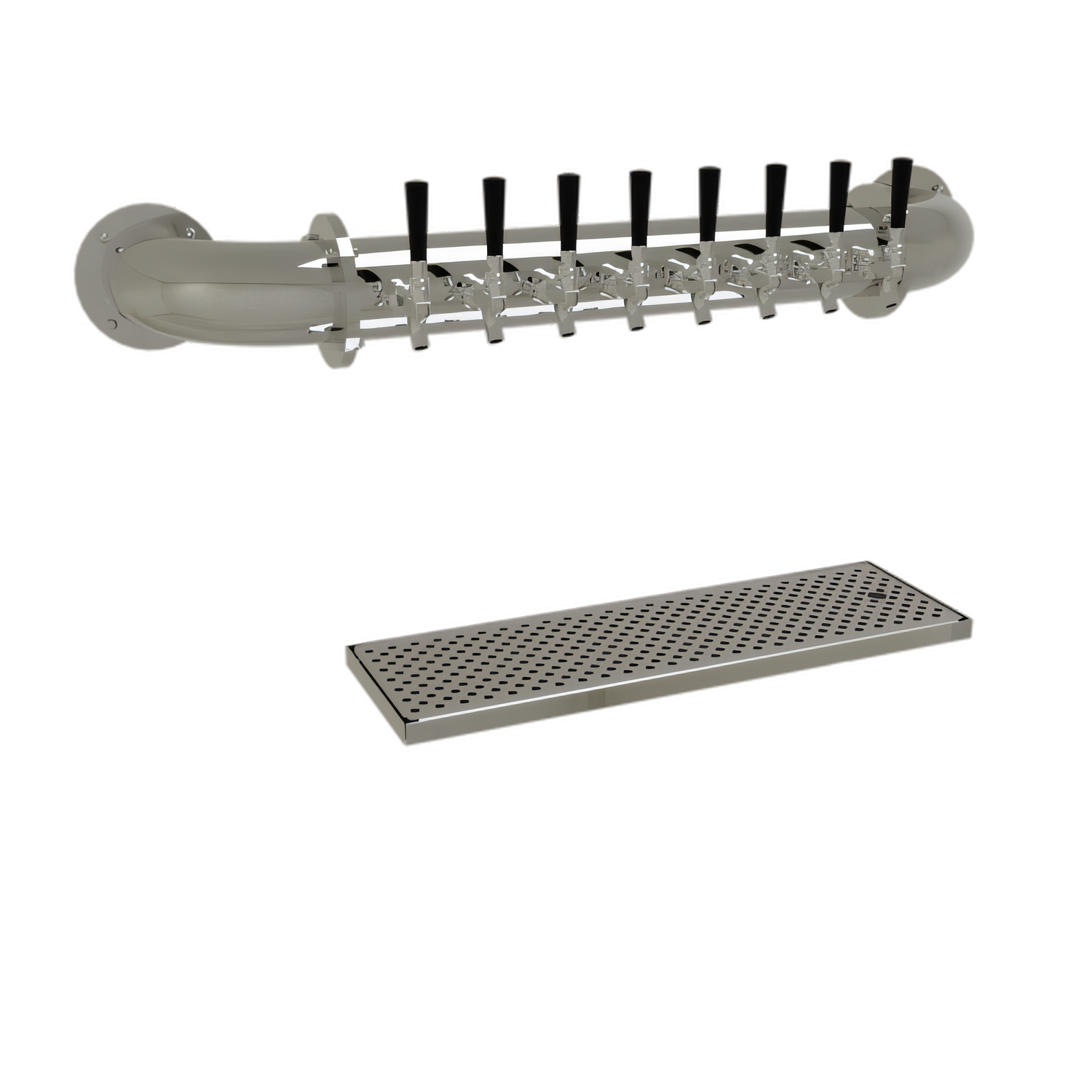 Pipe Wall Draft Dispensing Tower, wall mount, (8) stainless steel faucets (handles not included), glycol-cooled, insulated cold plate assembly, surface mount drain pan with removable perforated insert, all stainless steel construction, mirror finish (NOTE: Made to order, not returnable)"
