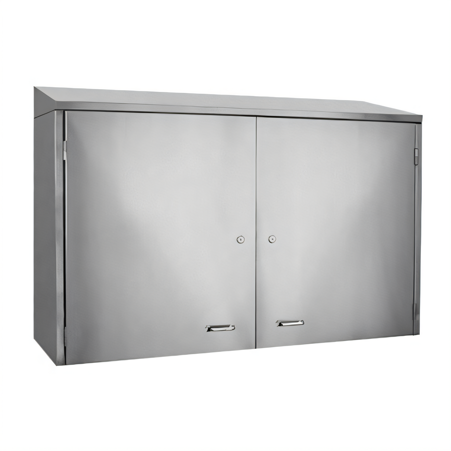 Wall Mount Cabinet, enclosed front, 72"W x 15"D x 32"H, (4) hinged doors with locks & positive latch catches, intermediate shelf, sloped top, includes wall mounting bracket, stainless steel construction, ETL-Sanitation (NOTE: Made to order, not returnable)