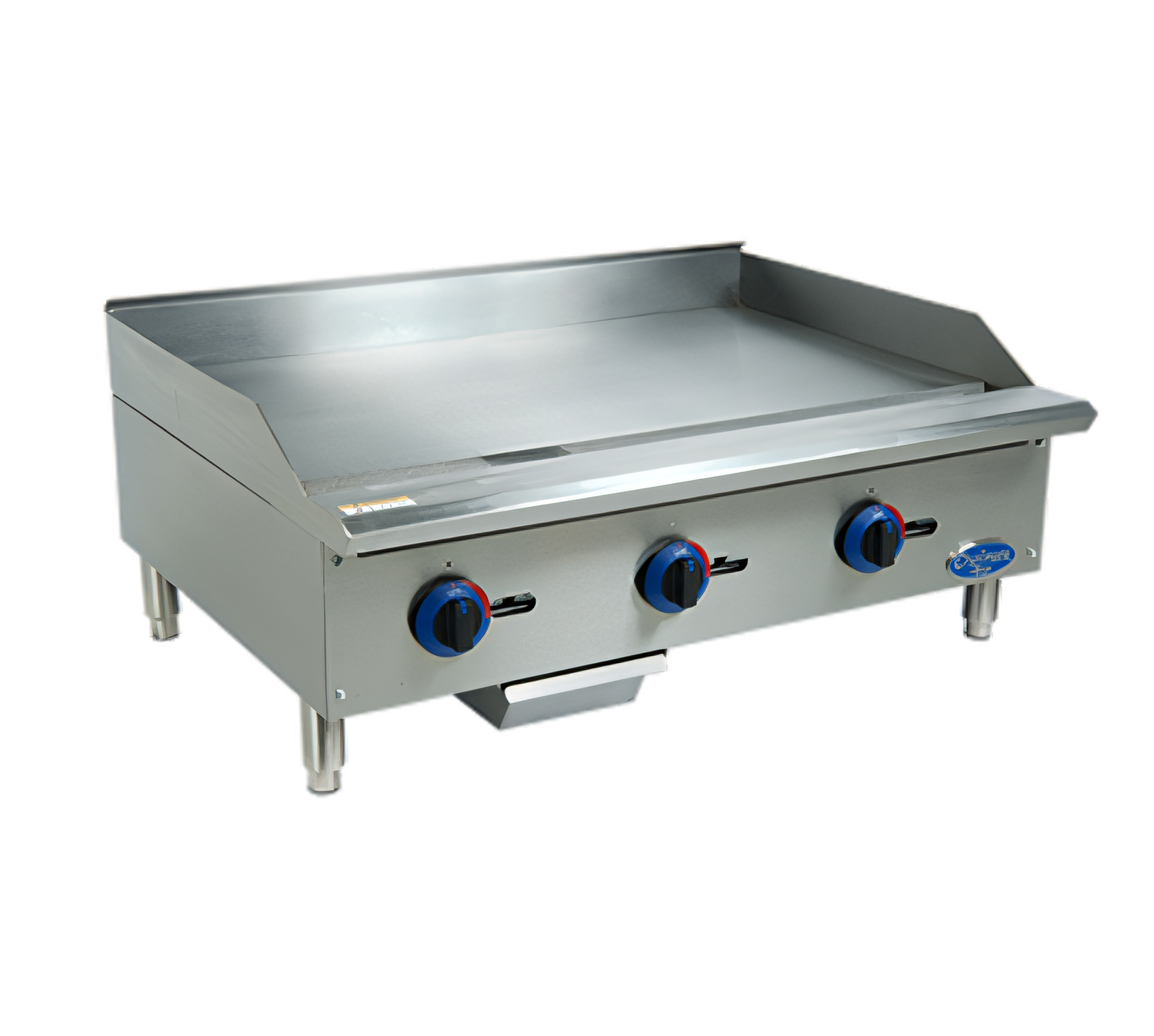 Quick-Ship • 90,000 BTU • Natural Gas w/ LP Conversion KitTake on breakfast rushes, lunch lines, and late-night service with the power and versatility of the Chefmate™ C36GG. Three high-performance burners deliver even heat across a 36-inch, 3/4-inch-thick plate—giving you the capacity and control to sear, sauté, or hold with confidence.