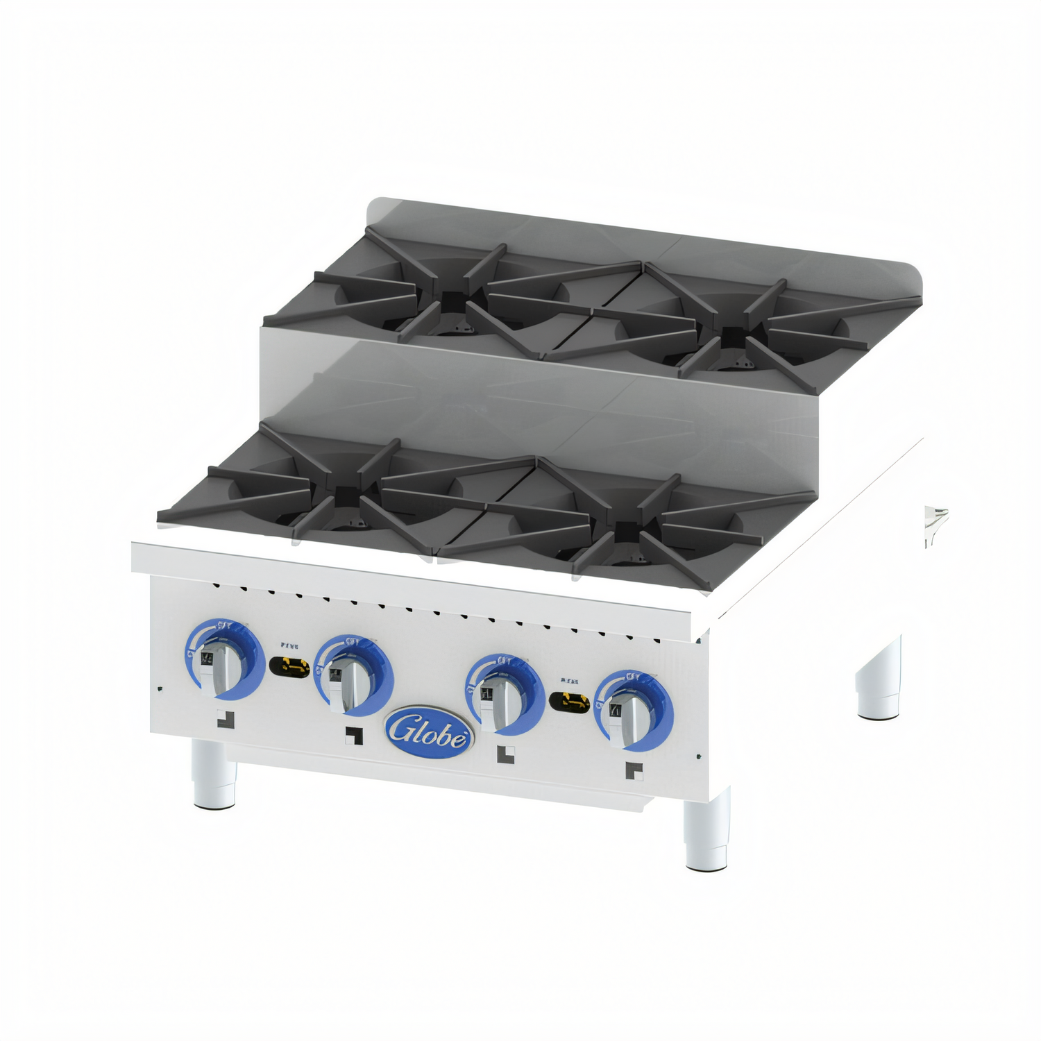4 × 30,000 BTU burners • 120,000 BTU total • Quick ShipPack more power into your cookline without sacrificing space. Globe’s two-tier GHPSU424G delivers a full 120,000 BTU of cooking muscle in a compact 24" footprint—perfect for sauté, sauce prep, small-batch stock, and à-la-minute menu work.