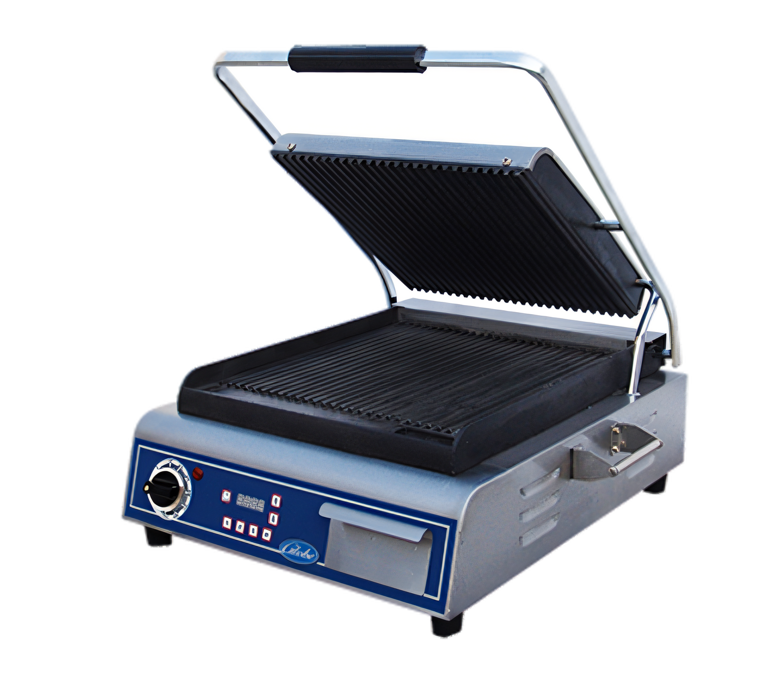 - Seasoned cast-iron grooved plates deliver authentic grill marks and superior heat retention.