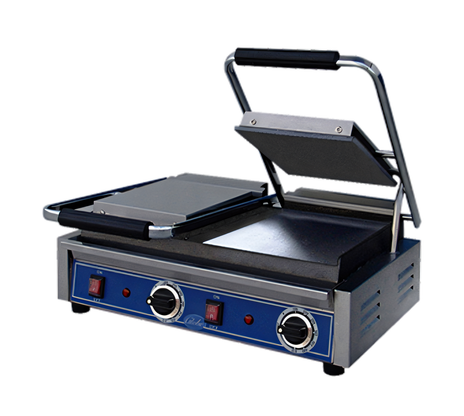 - Double grill design: one 18" × 9" bottom plate with two split 10" upper plates to cook separate orders simultaneously.