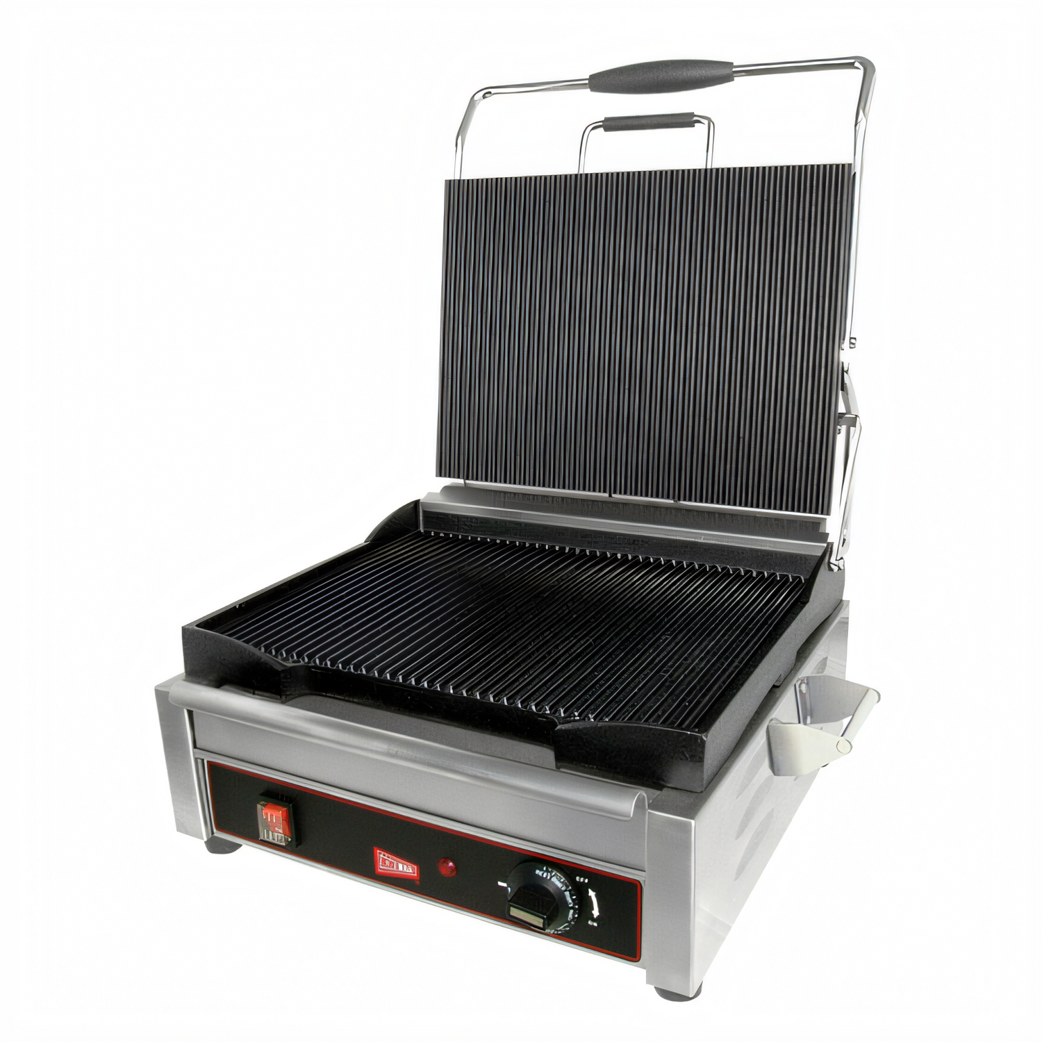 Crathco Cooking - (LV9R013P) Cecilware® Pro Sandwich/Panini Grill, single, 14"W x 11"D grooved cast iron cooking surface, fixed lower grill, self-balanced hinged upper grill, stainless steel construction, 120v/60/1-ph, 1.8kW, 15.0 amps, NEMA 5-15P, UL, NSF