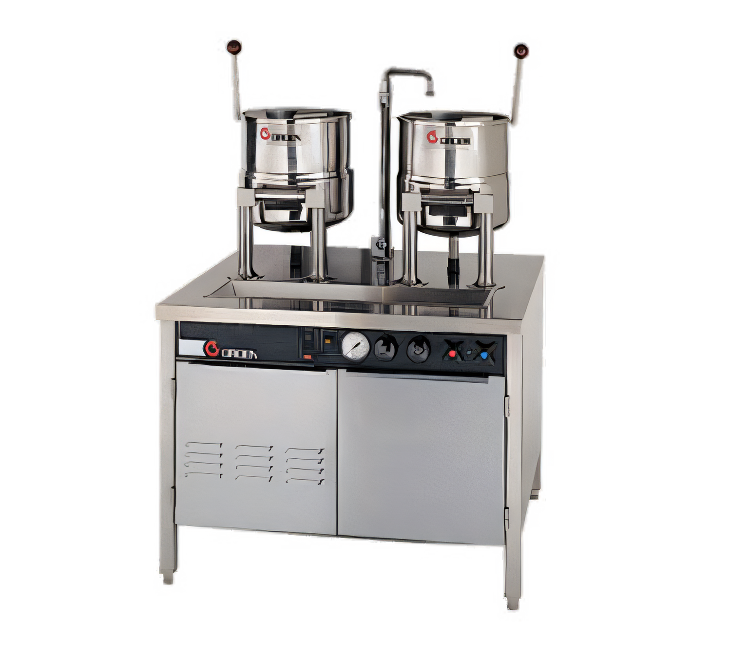 - All-stainless construction: 304 SS cabinet, doors and kettle shells resist corrosion and wipe clean fast.