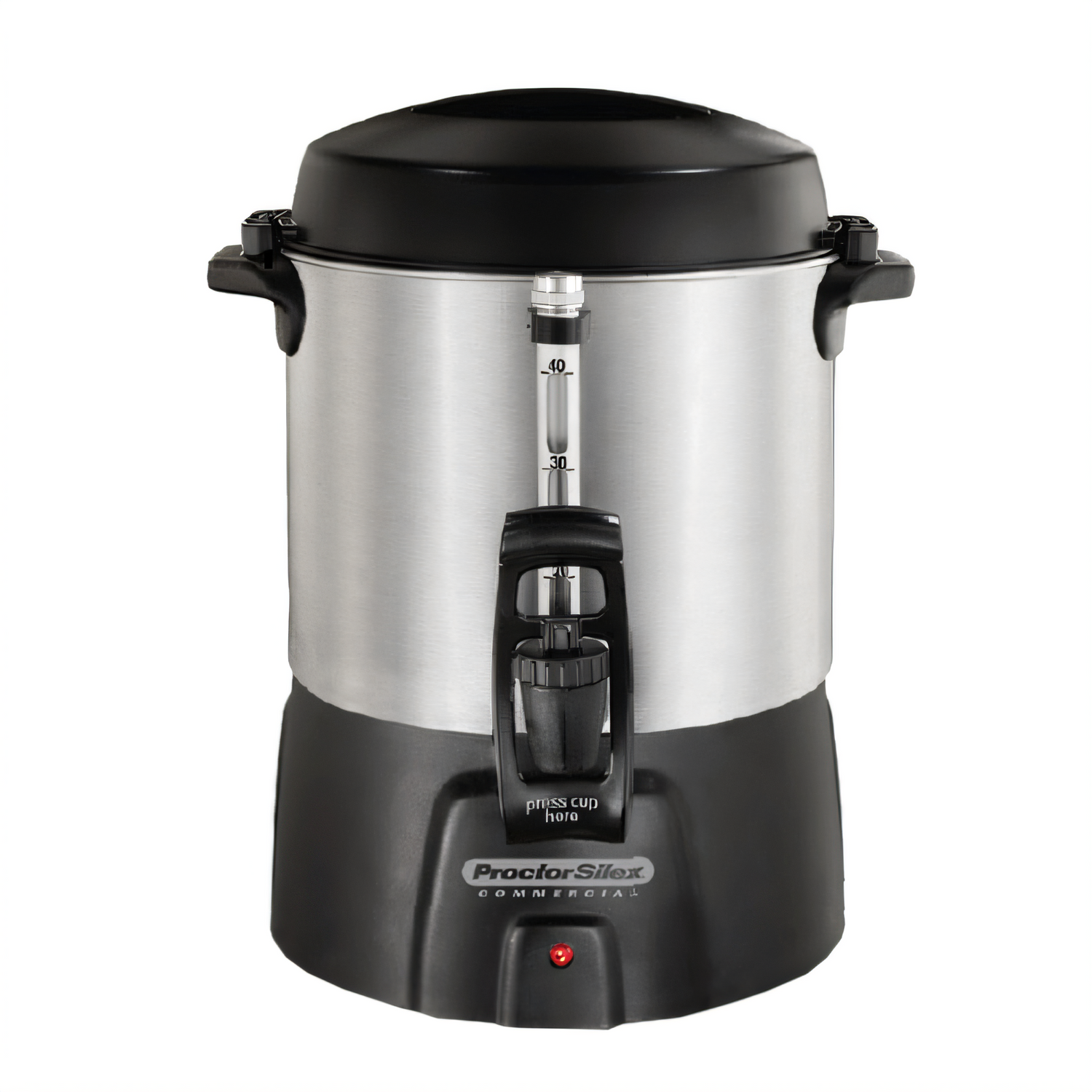Proctor-Silex® Coffee Urn, 40 cup capacity, single wall insulation, commercial duty, dual heaters, one hand serving with tall base for 12 oz. cups, cup a minute brewing, shielded coffee level indicator, ready to serve light, cool touch handles, locking lid, brushed aluminum, 120v/60/1-ph, 1090 watts, ETL, NSF