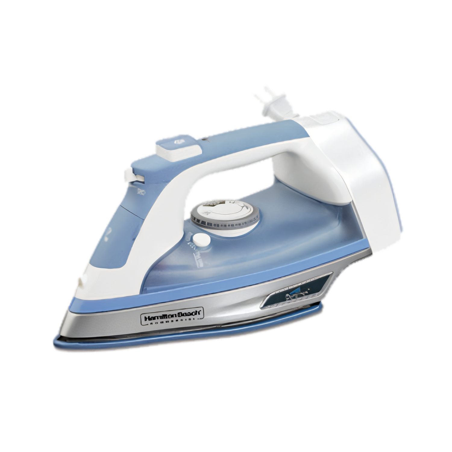 Hamilton Beach HIR750 Durathon hotel iron: 1500W full-size with non-stick anti-drip soleplate, auto shut-off, dial controls, retractable cord.