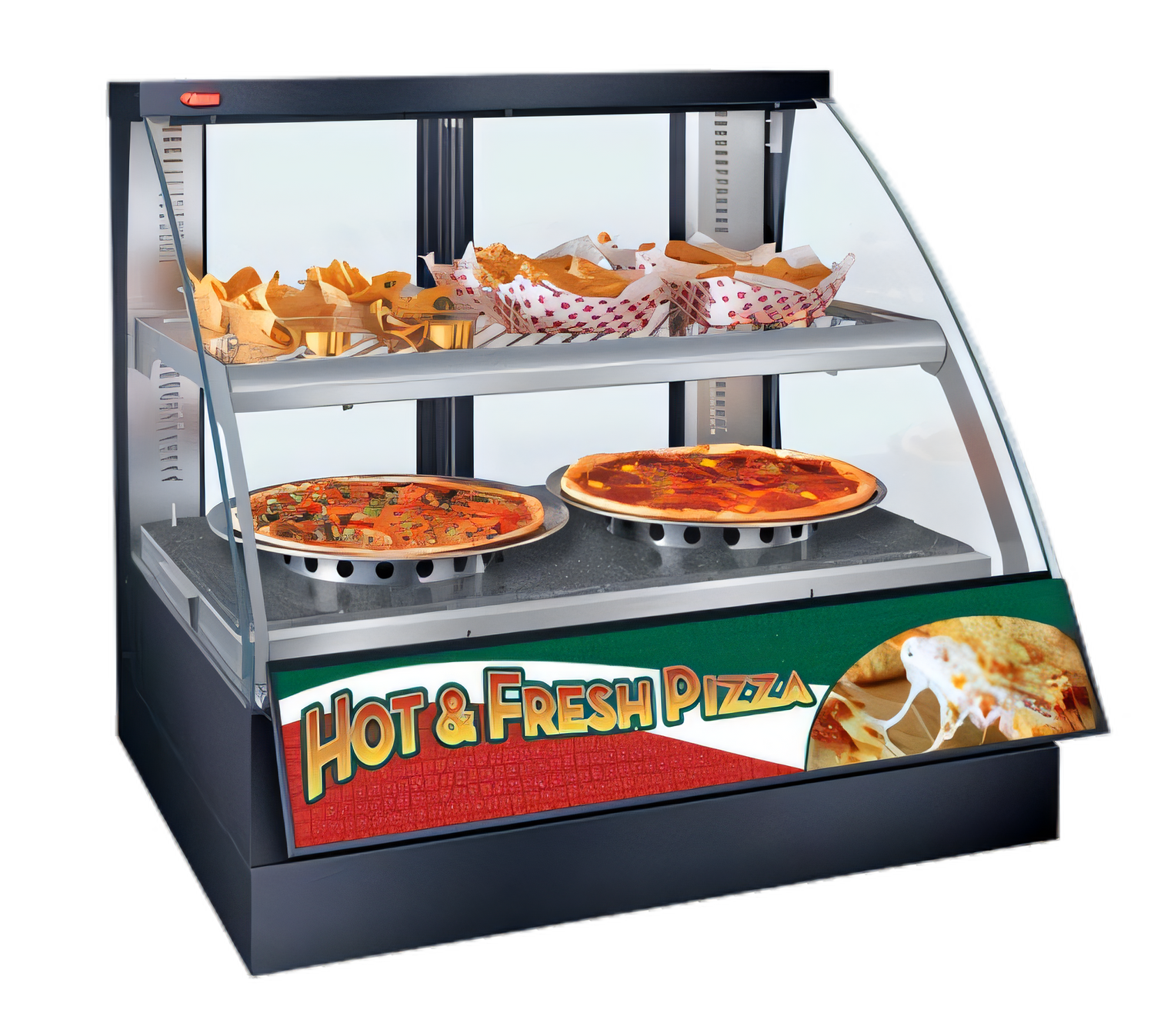 Countertop • Curved Glass • Dual-Shelf 2-Pan CapacityShowcase pizza, fried chicken, breakfast sandwiches and other grab-and-go favorites in their best light—and at their best temperature. The Flav-R-Savor® FSCDH-2PD combines gentle convected heat with adjustable humidity to keep food fresh and appetizing for hours while its sleek curved-glass design drives impulse sales from every angle.