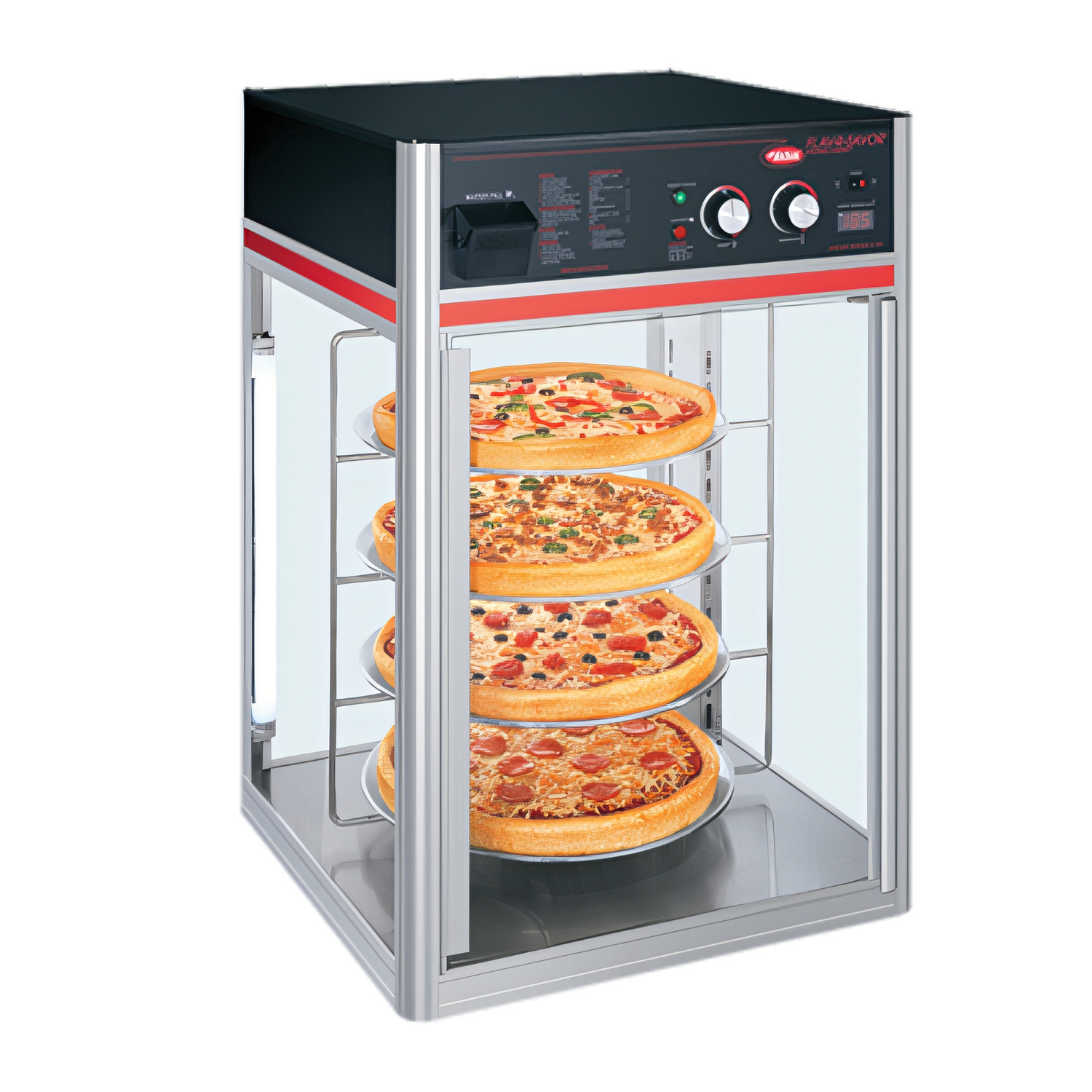 Model FSDT-2 | 2-Door • 4-Tier Rotating Rack • 120 VKeep pizza, fried foods, pastries and other grab-and-go favorites hot, fresh and irresistibly visible. Hatco’s Quick Ship FSDT-2 balances gentle heat with controlled humidity, extending hold times up to four hours while the rotating 4-tier rack and bright LED lighting turn every product into an impulse sale.