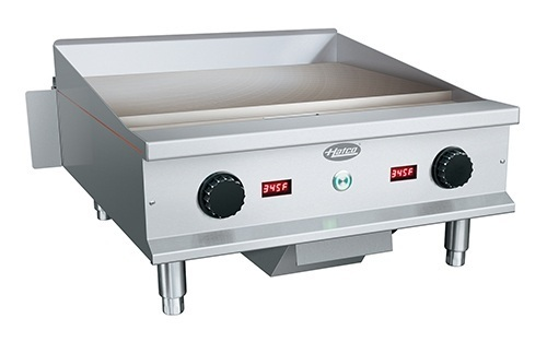 Hatco IGRID-2418-FS induction griddle: stainless 24" countertop with 2 zones, digital controls, power-save, high-efficiency cooking.