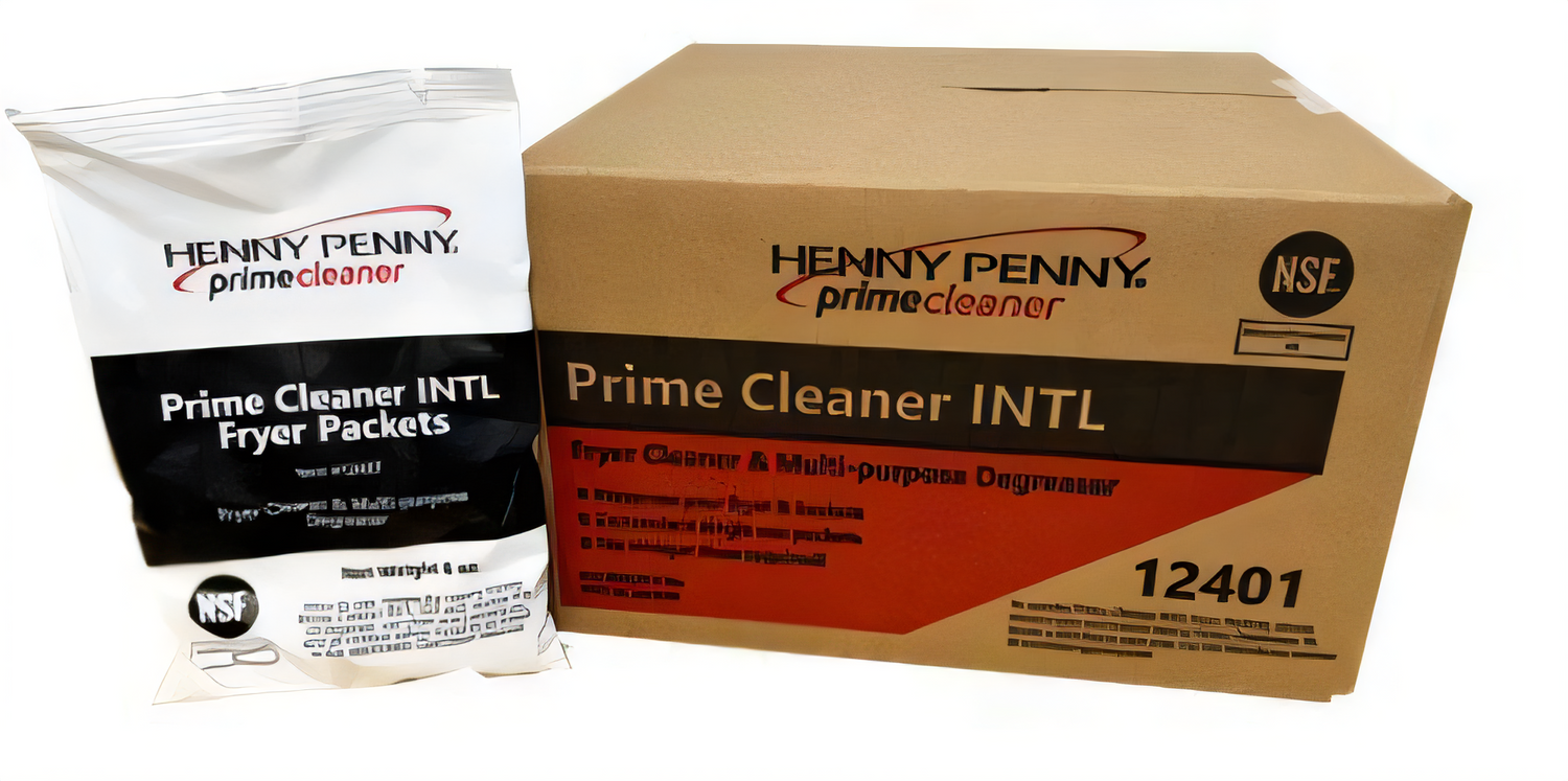 Henny Penny Prime Cleaner fryer packets, 6 oz, 24 per case — powerful degreasing for commercial fryers; international sales only.