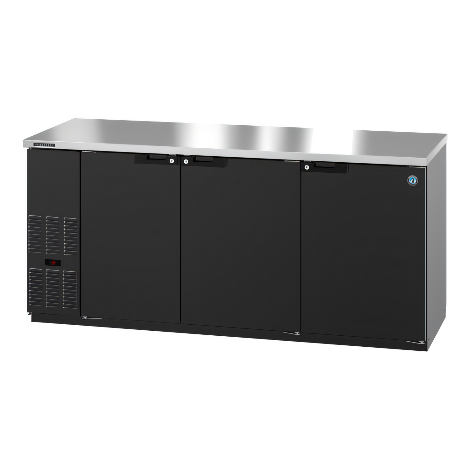 Three-section, side-mount reach-in coolerKeep up to 1,092 ice-cold 12 oz. cans or four ½-barrel kegs right where you serve them with the Hoshizaki BB80. Built Beyond Strong™ with an 18-gauge stainless worktop and rugged black vinyl exterior, this back-bar powerhouse holds NSF-7 temperatures even in 100 °F ambient bar conditions.