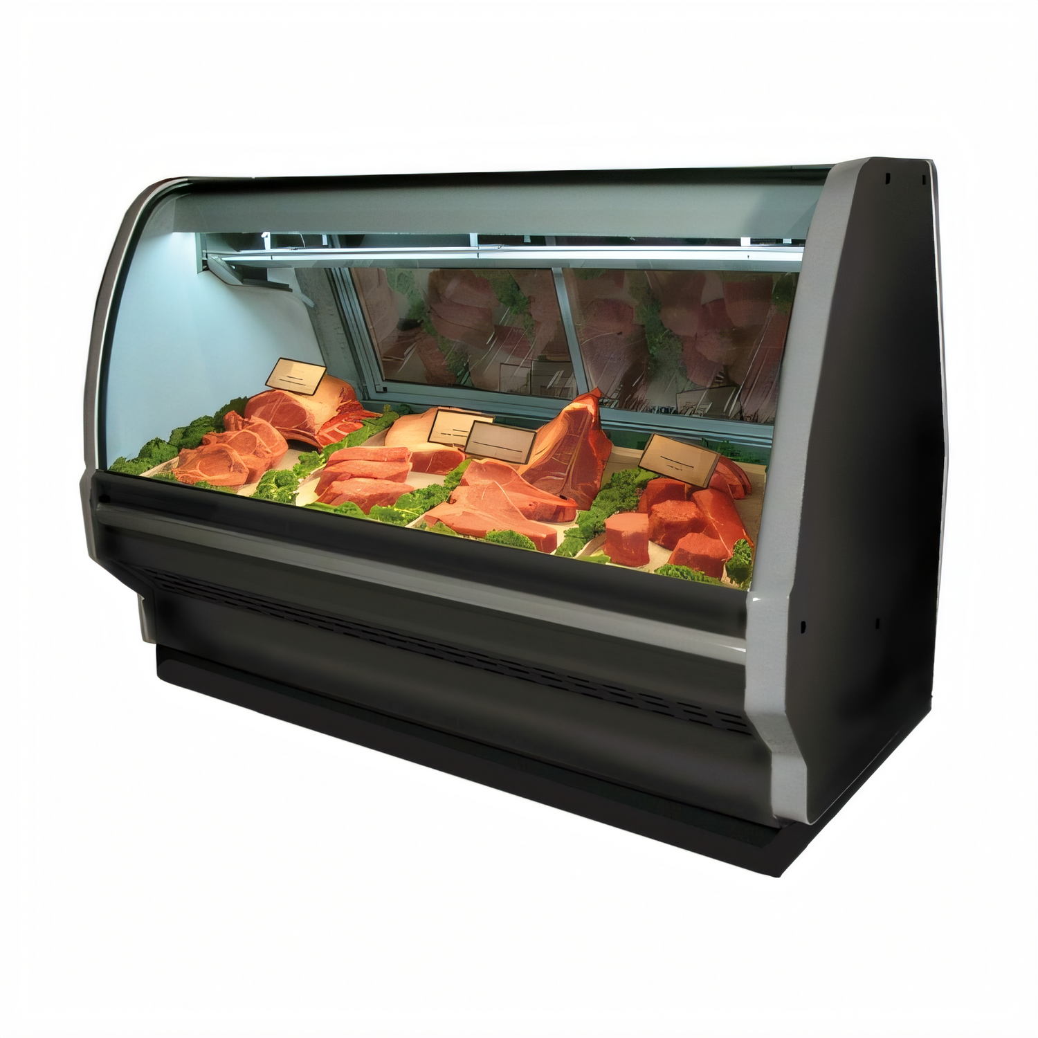 Red Meat Service Case, 75-1/2'W, single duty, endless design, double bend curved glass, full length gravity coil system, extra full length humidity coil at the main deck, stainless steel top, black exterior & white interior, designed for remote refrigeration, R448A expansion valve included, remote condensing units & other hook ups are not included, 115v, 1.3 amps, 2100 BTU , cULus, UL EPH Classified, UL-Sanitation **NOTE: RED MEAT CASES COME WITH MAIN DECK ONLY. MEZZANINE SHELF,PILASTER & SHELF LIGHTING WILL NEED TO BE ADDED AS OPTIONS**