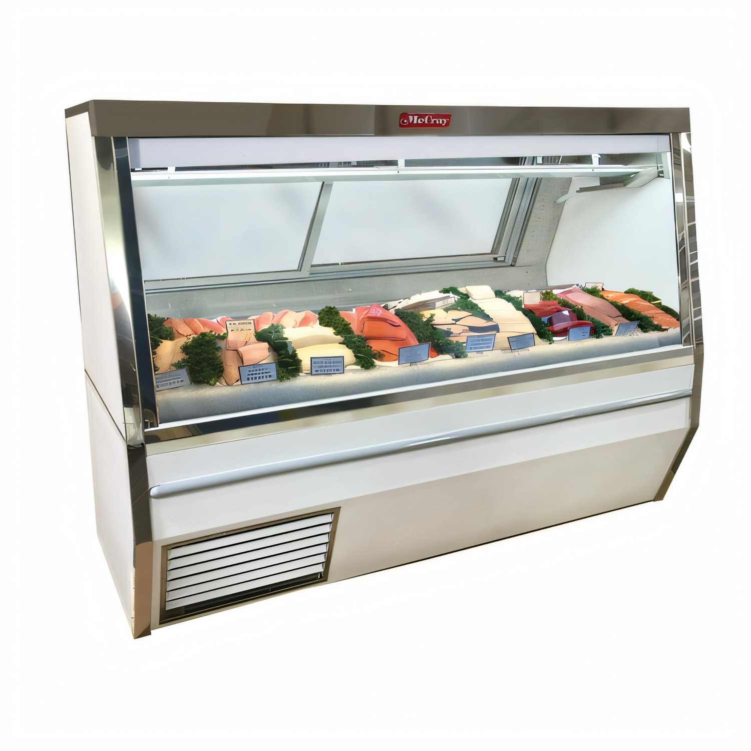 Howard-McCray 34N refrigerated fish/poultry service case, 120" self-contained, stainless steel, LED-lit, gravity coil, UL-sanitation certified.