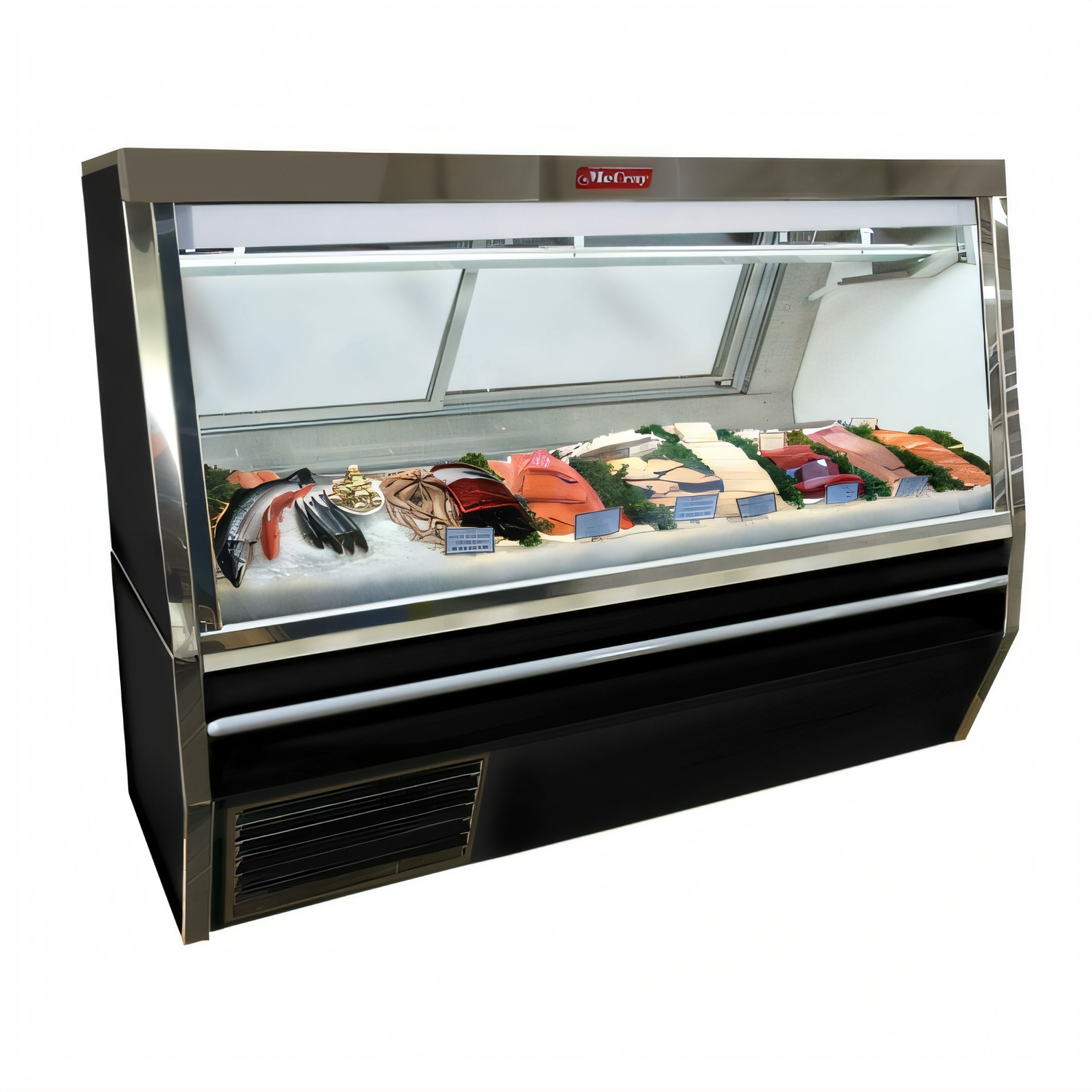 Howard-McCray 34N refrigerated fish/poultry service case, 72" self-contained, stainless steel, LED lighting, gravity coil, UL-sanitary certified.