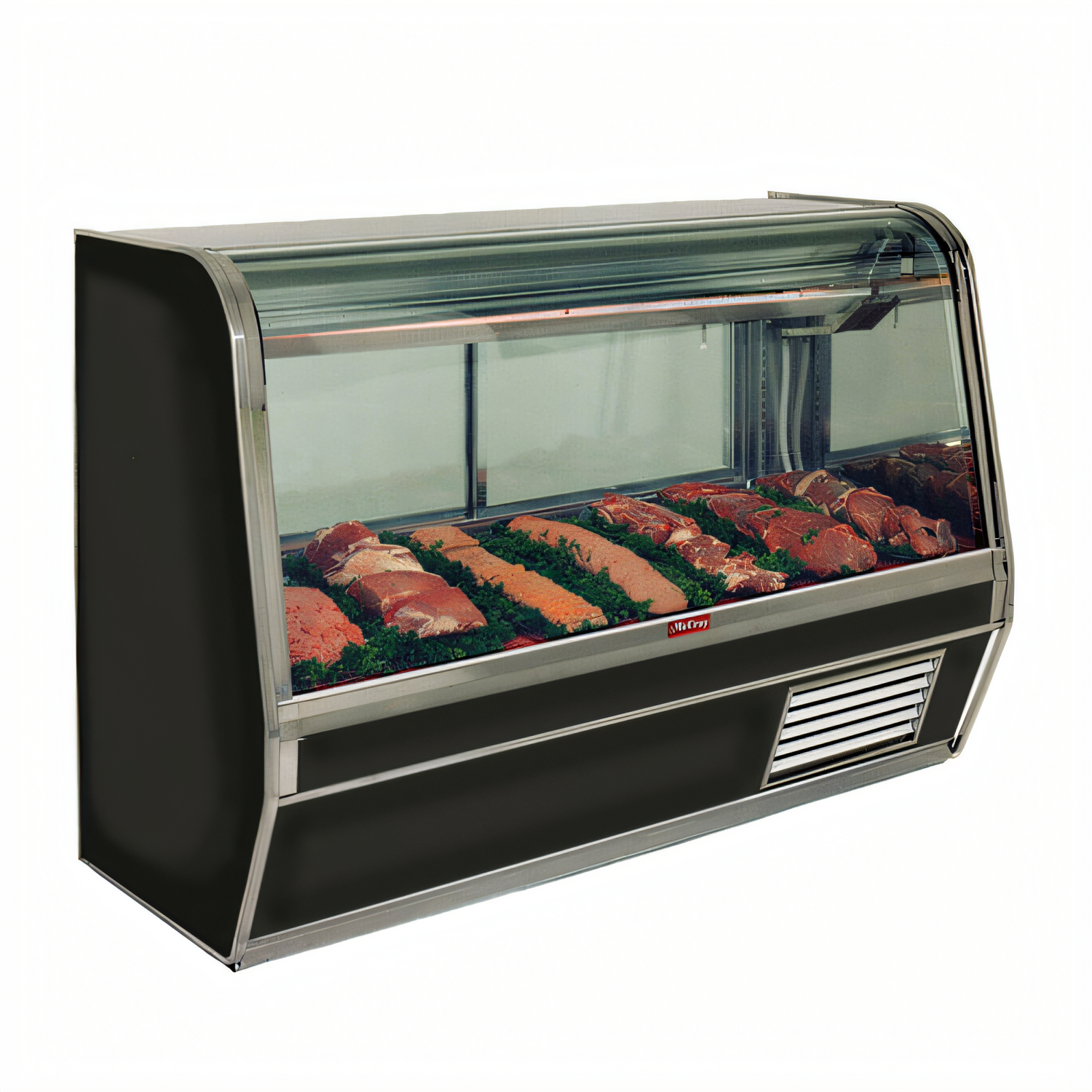 Curved Glass Red Meat Service Case, 50'W, single duty, endless design, full length gravity coil system, self-contained refrigeration, extra full length humidity coil at the main deck, stainless steel top & interior ends, black exterior & white interior (mirrored stainless inside ends standard), LED lighting,1/4 HP, 115v/60/1-ph, 12.0 amps, cULus, UL EPH Classified, UL-Sanitation **NOTE: RED MEAT CASES COME WITH MAIN DECK ONLY. MEZZANINE SHELF,PILASTER & SHELF LIGHTING WILL NEED TO BE ADDED AS OPTIONS**