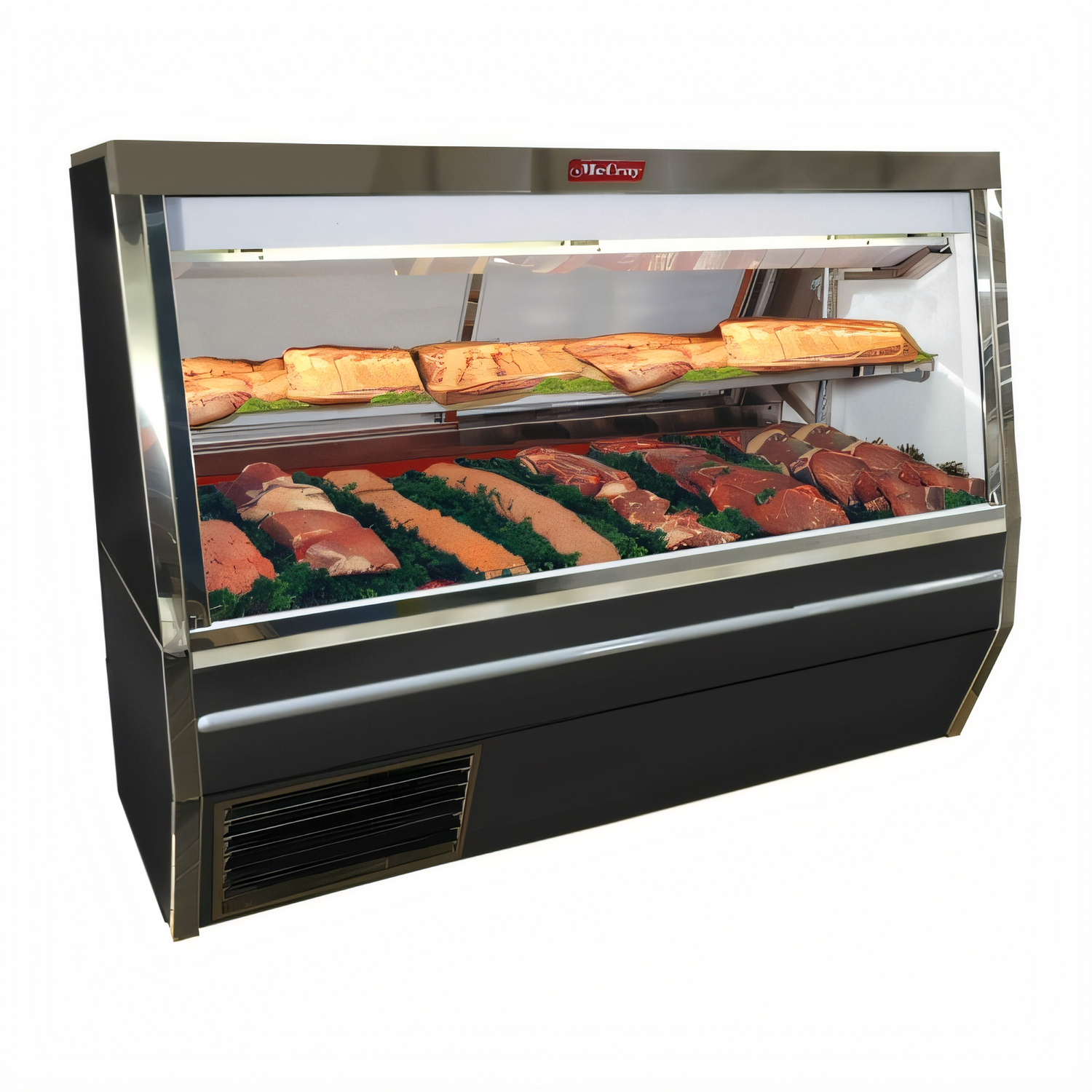 Red Meat Service Case, double duty, stand alone design 48'W, self-contained refrigeration, full length gravity coil system, upper & lower compartments, stainless steel top, black exterior & white interior, LED lighting, 1/4 HP, 115v/60/1-ph, 12.0 amp, **Removable external door adds 2', cULus, UL EPH Classified, UL-Sanitation **NOTE: RED MEAT CASES COME WITH MAIN DECK ONLY. MEZZANINE SHELF,PILASTER & SHELF LIGHTING WILL NEED TO BE ADDED AS OPTIONS**