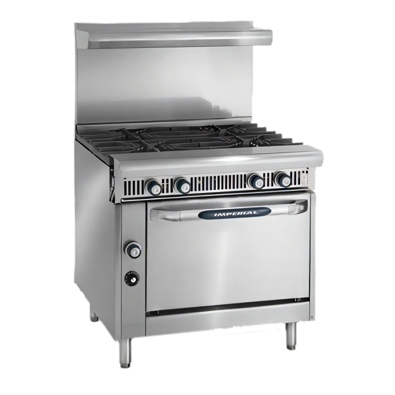 Model IHR-4 – 4 Open Burners / Standard Oven – 200,000 BTUBuilt for demanding commercial kitchens, the Imperial Spec Series IHR-4 combines four ultra-powerful open burners with a full-size standard oven, all inside a rugged 36-inch footprint. Stainless-steel construction, easy-clean features, and NSF certification make it a workhorse you can count on shift after shift.